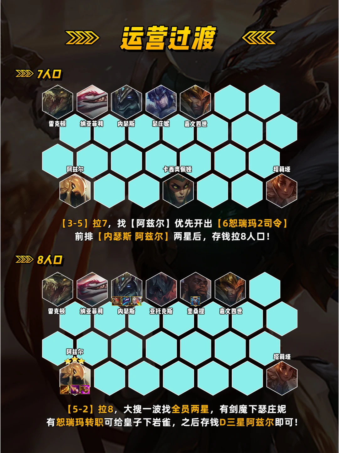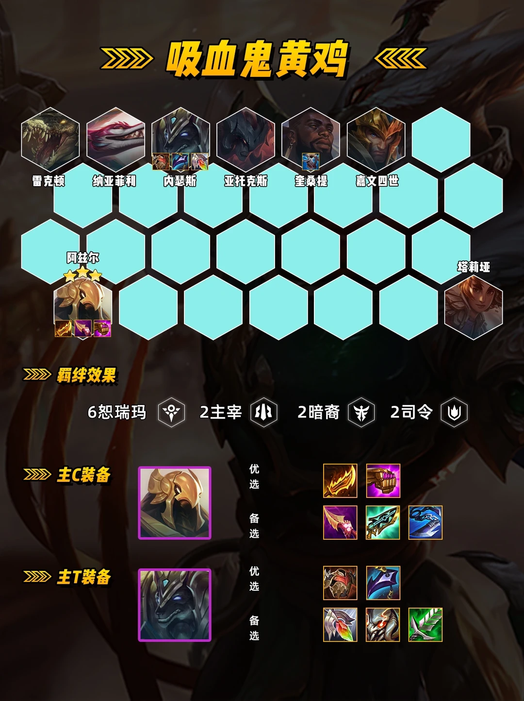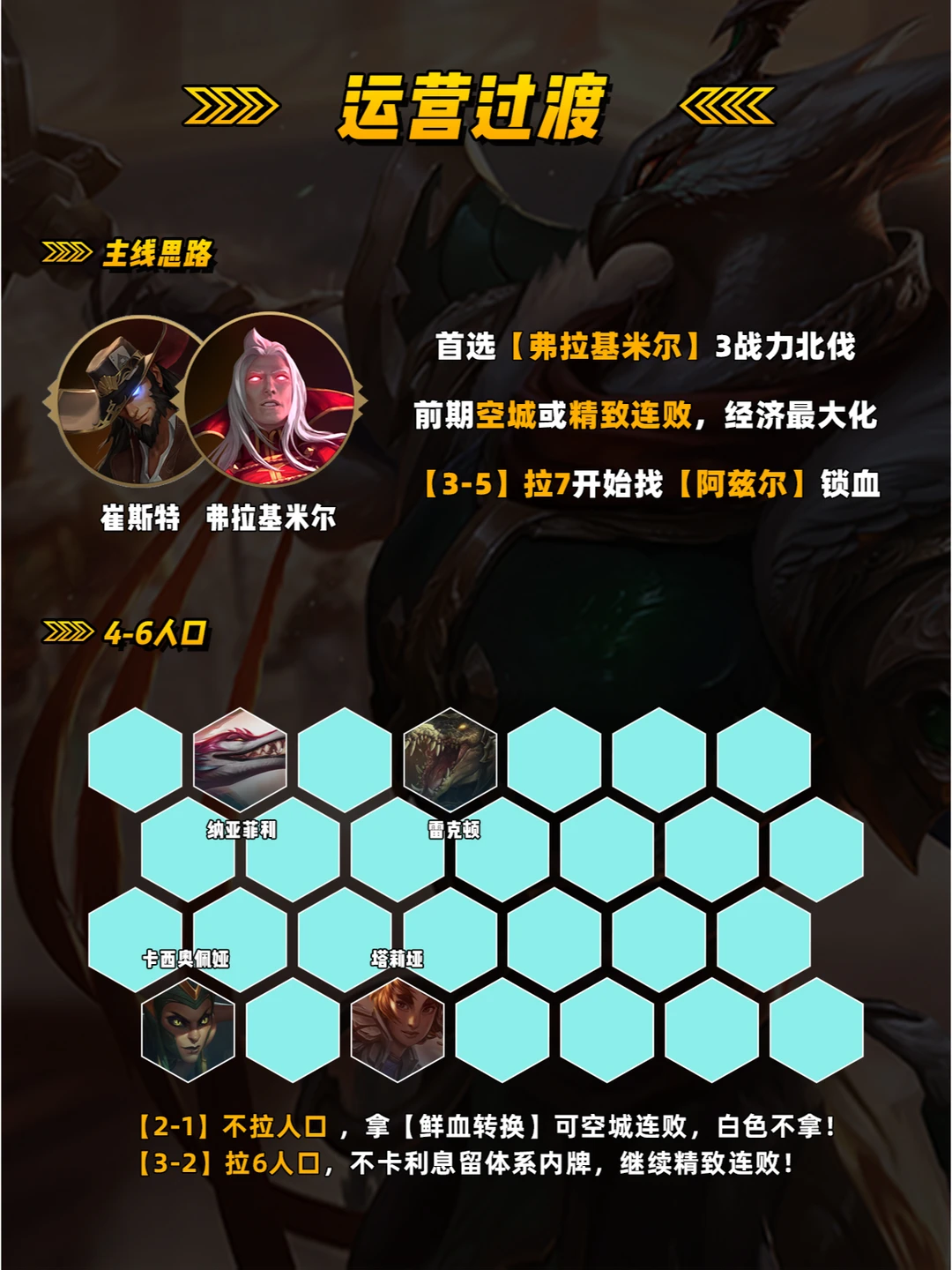 运营思路 前期走连败,选秀拿攻速装 优先做黄鸡装备[羊刀 纳什之牙] 3阶段拿体系内牌,选秀如果有 内瑟斯和阿兹尔直接拿! 英雄之力 吸血鬼之力,3战力强度高 必拿[鲜血转换]和[飞升] 崔斯特之力,运营过渡平滑 可做完美神装!