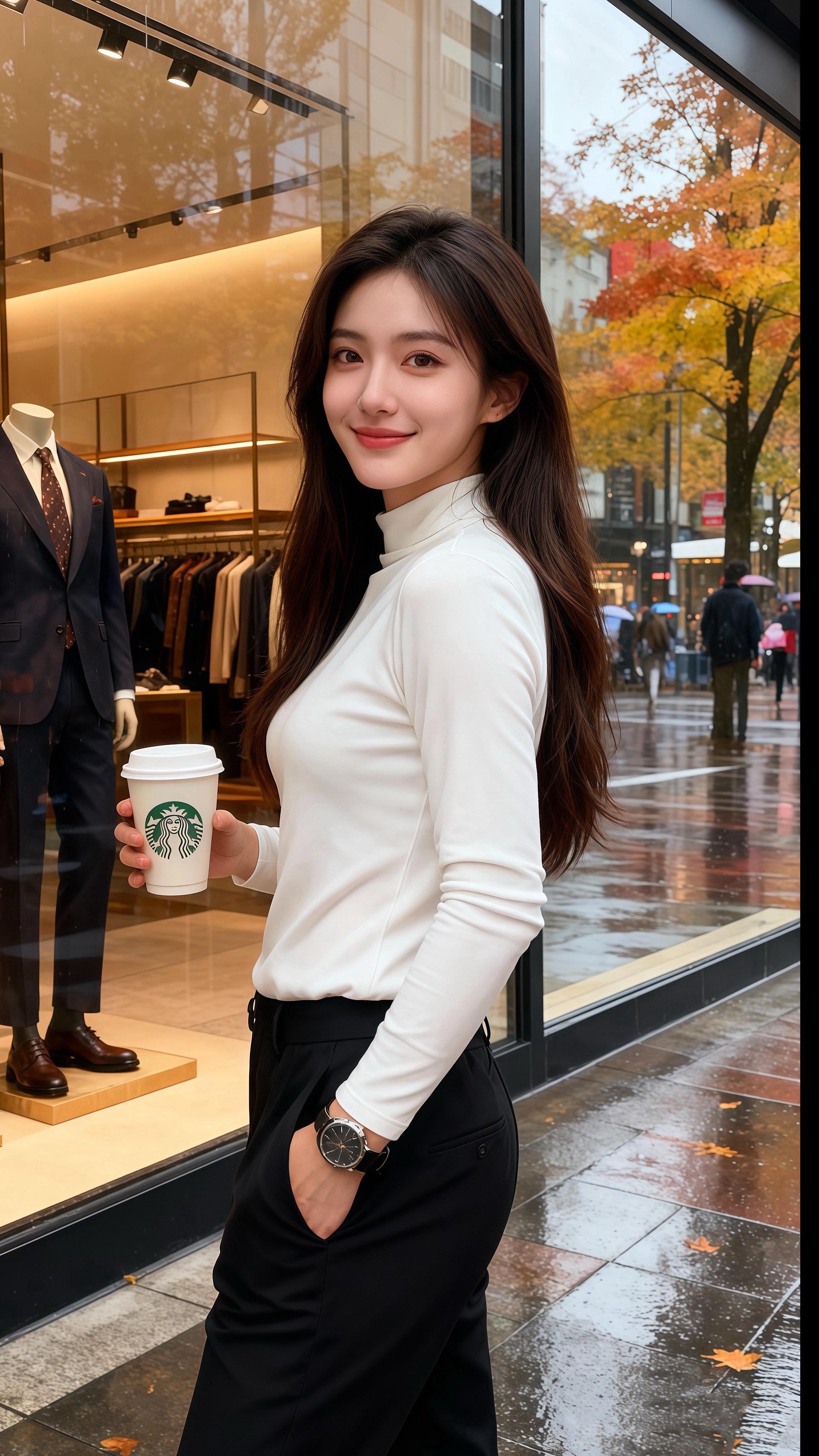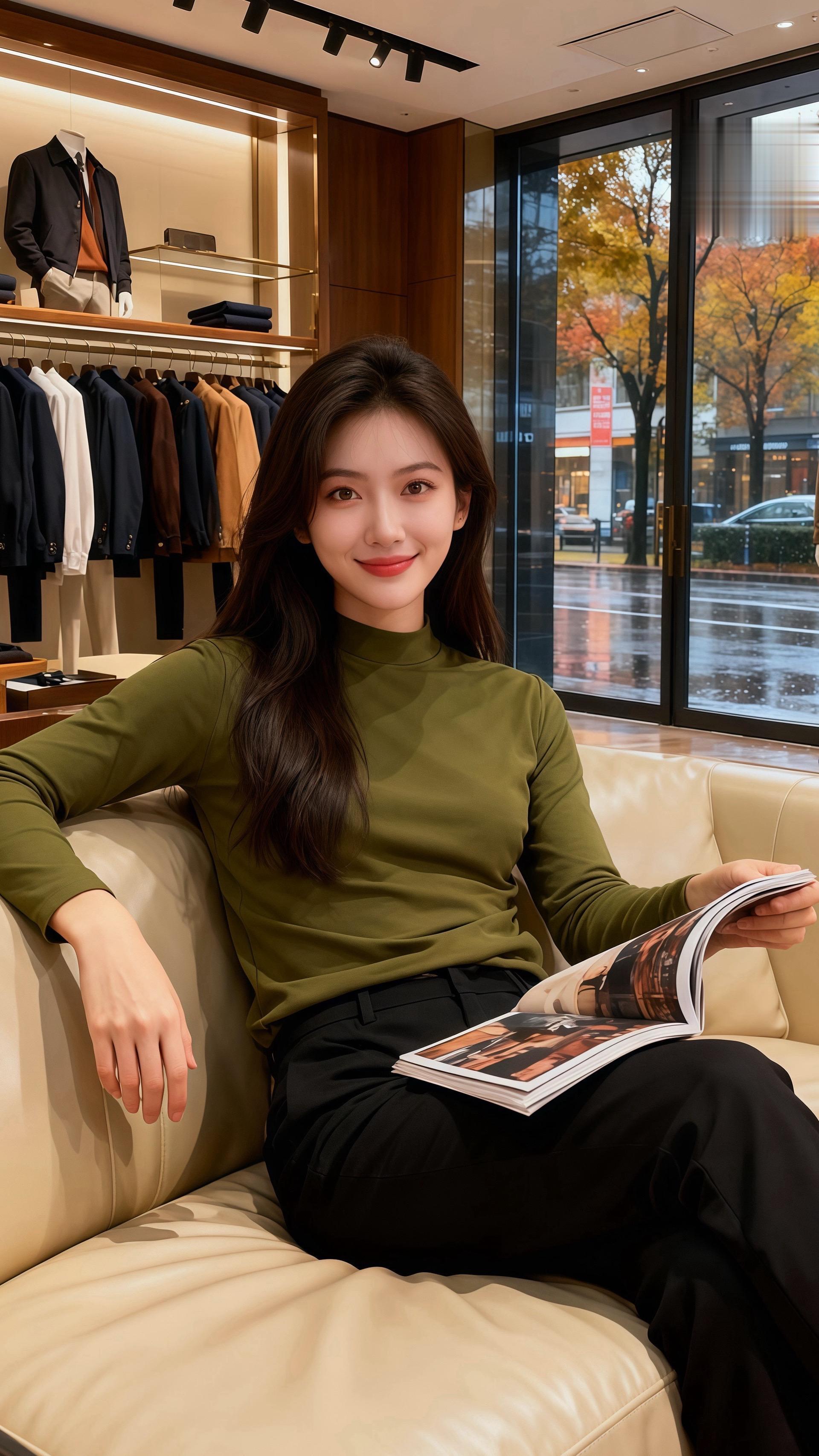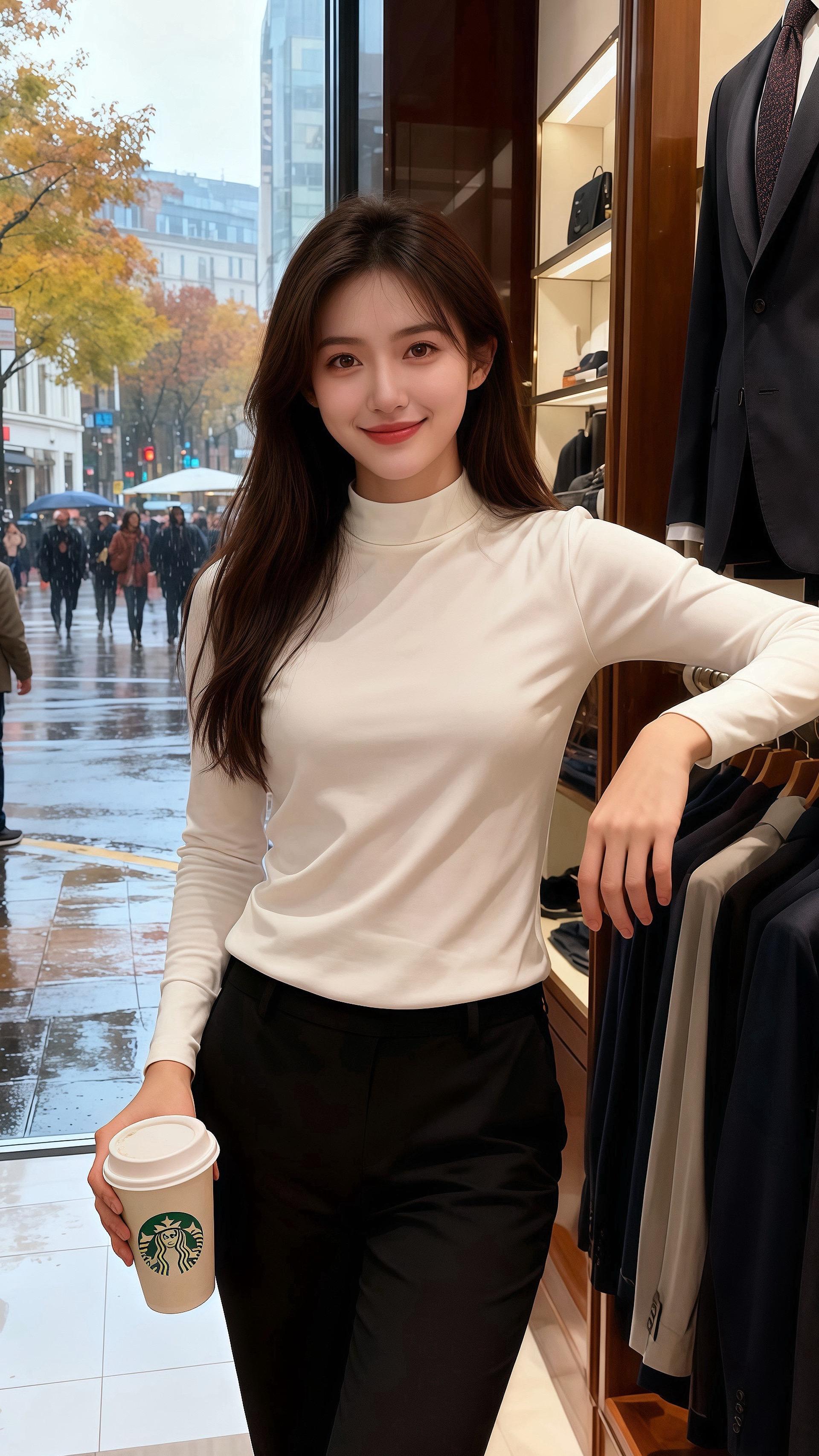 雨丝裹着桂香黏在橱窗上,许妍倚着衣架等皓明,身上是刚随手拿的米白高领衫。