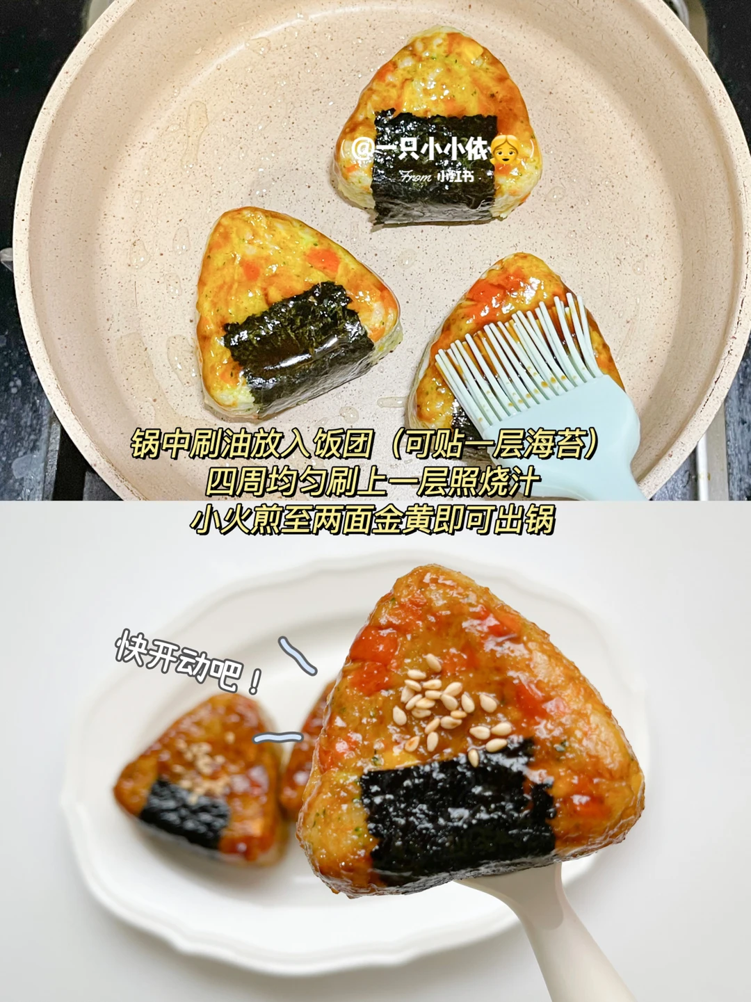 4️⃣锅中刷油,放入饭团(可贴一层海苔),四周刷上照烧汁,小火煎至两面金黄即可出锅