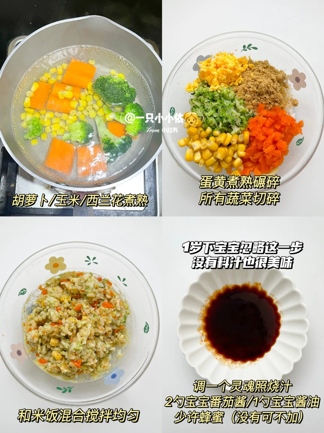 1️⃣米饭提前蒸熟,西兰花/胡萝卜/玉米煮熟,所有食材切末,和熟米饭混合搅拌均匀;