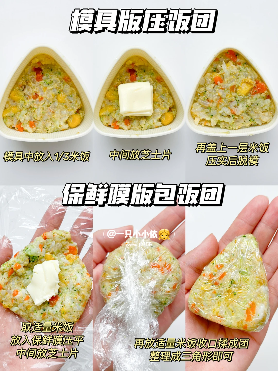 💛模具版:取适量米饭放入模具,中间放上芝士片,再盖上一层米饭,压实后脱模即可;