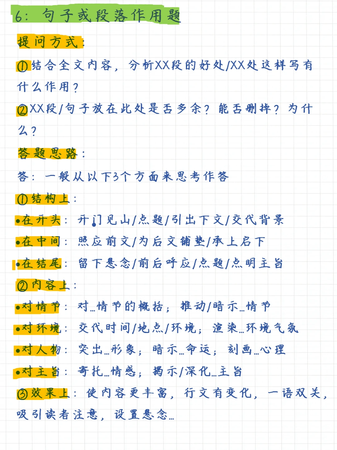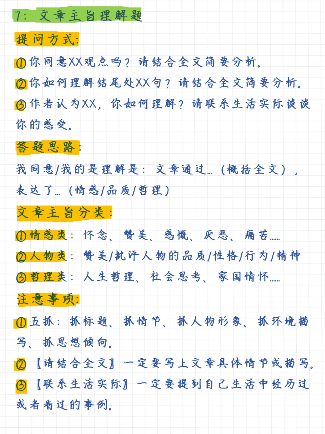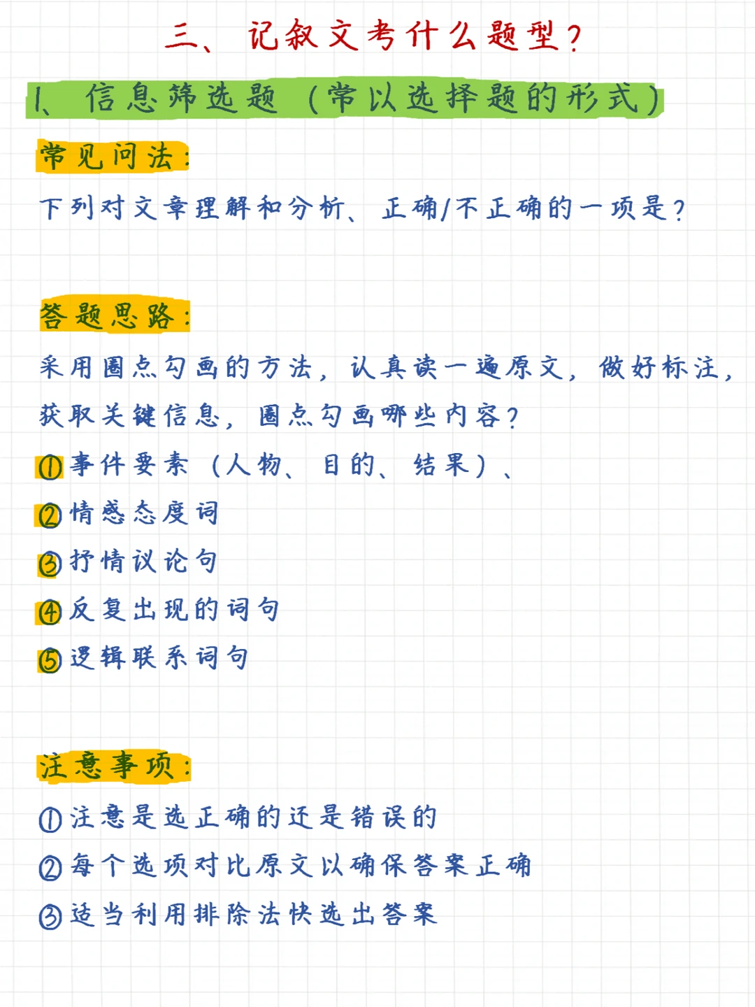 一句话总结记叙文阅读理解满分技巧:掌握6大知识要点、牢记7大常考题型 6⃣️大知识要点✅: 1、记叙顺序 2、记叙人称 3、描写手法 4、议论的作用 5、抒情的方法 6、修辞手法 7⃣️大题型✅: 1、信息筛选题 2、概括题 3、句子赏析题 4、人物形象题 5、标题的含义及作用题 6、句子或段落作用题 7、文章主旨理解题