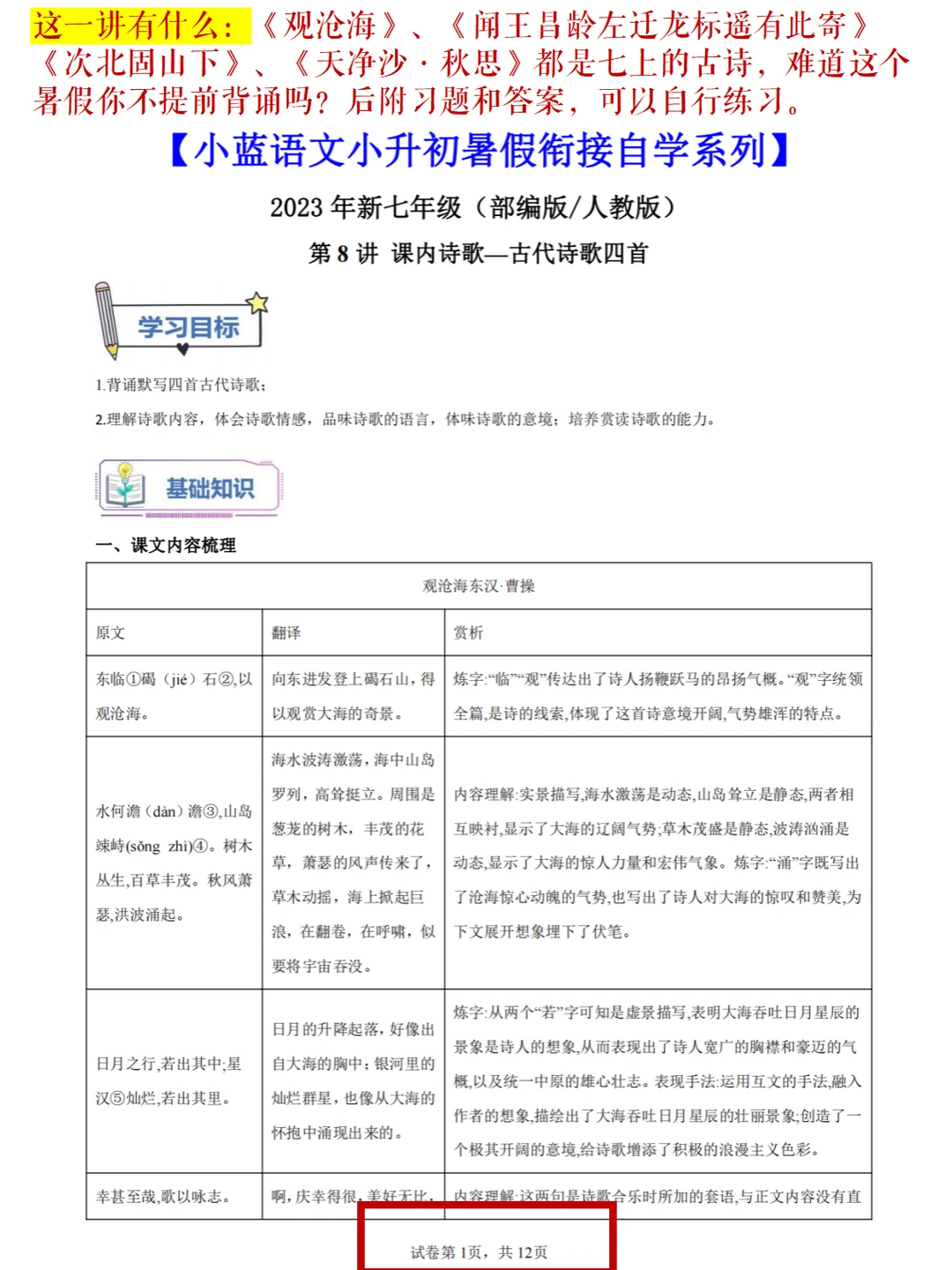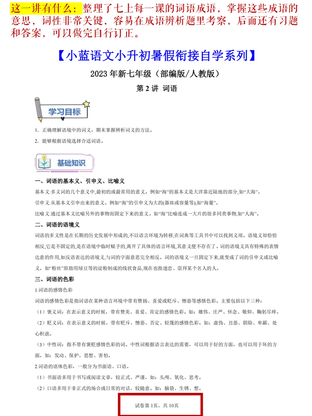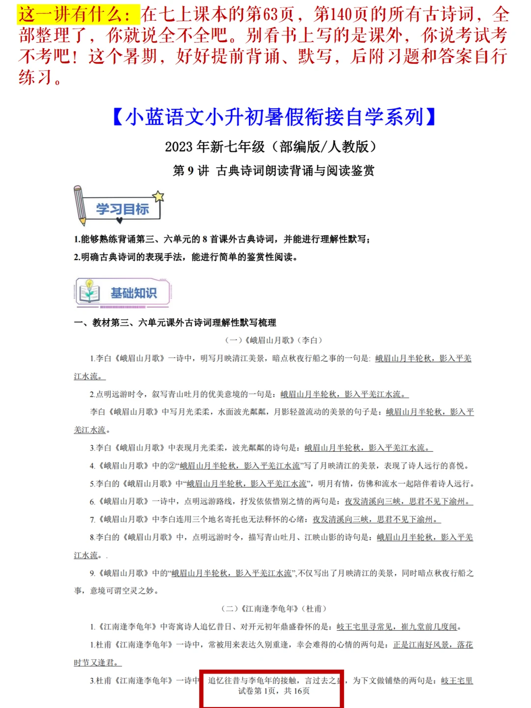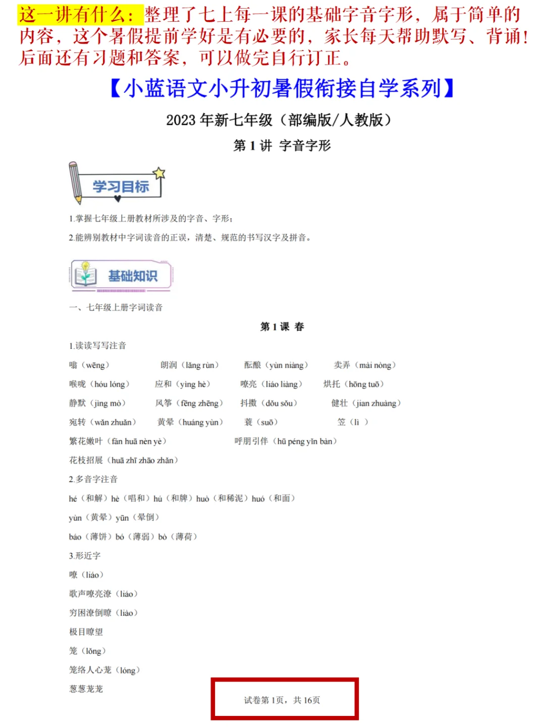 🙏今天,满足你们需求的资料终于来了,这个暑假就认准这一份,每天花1小时时间,先预习七上语文课本里的课文,然后拿出这份资料,找到对应章节,对基础知识进行背诵,完成对应的习题,然后对答案,订正,做好笔记。