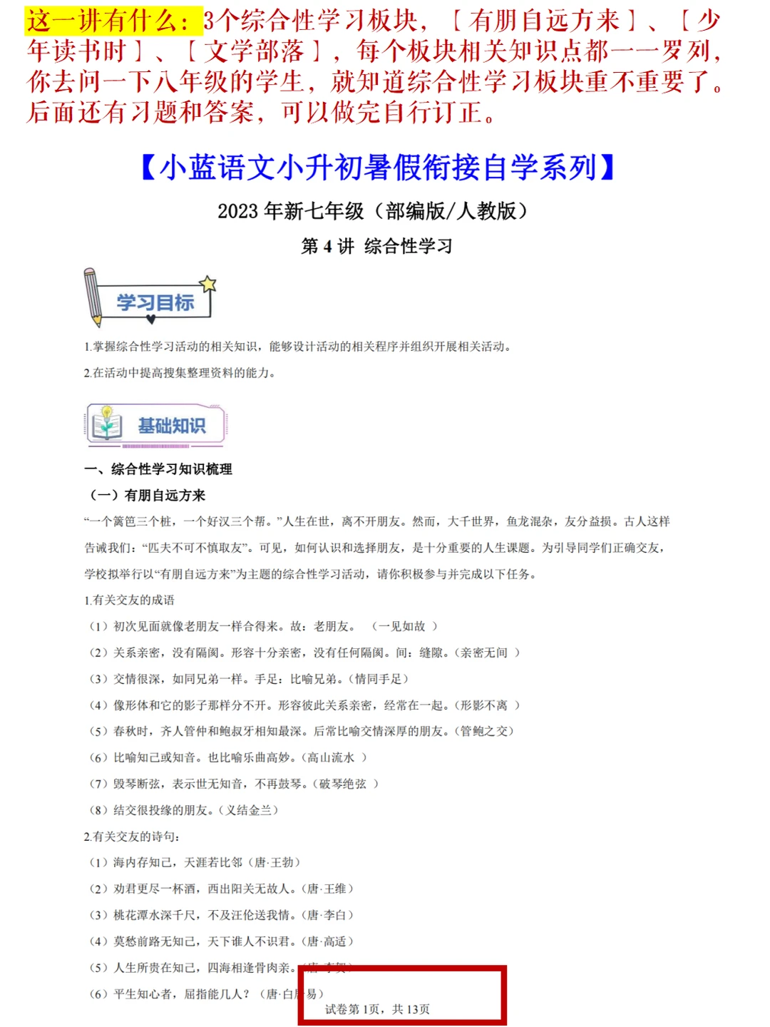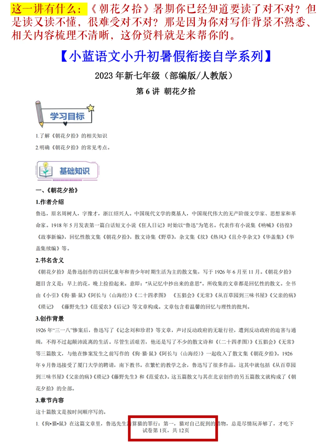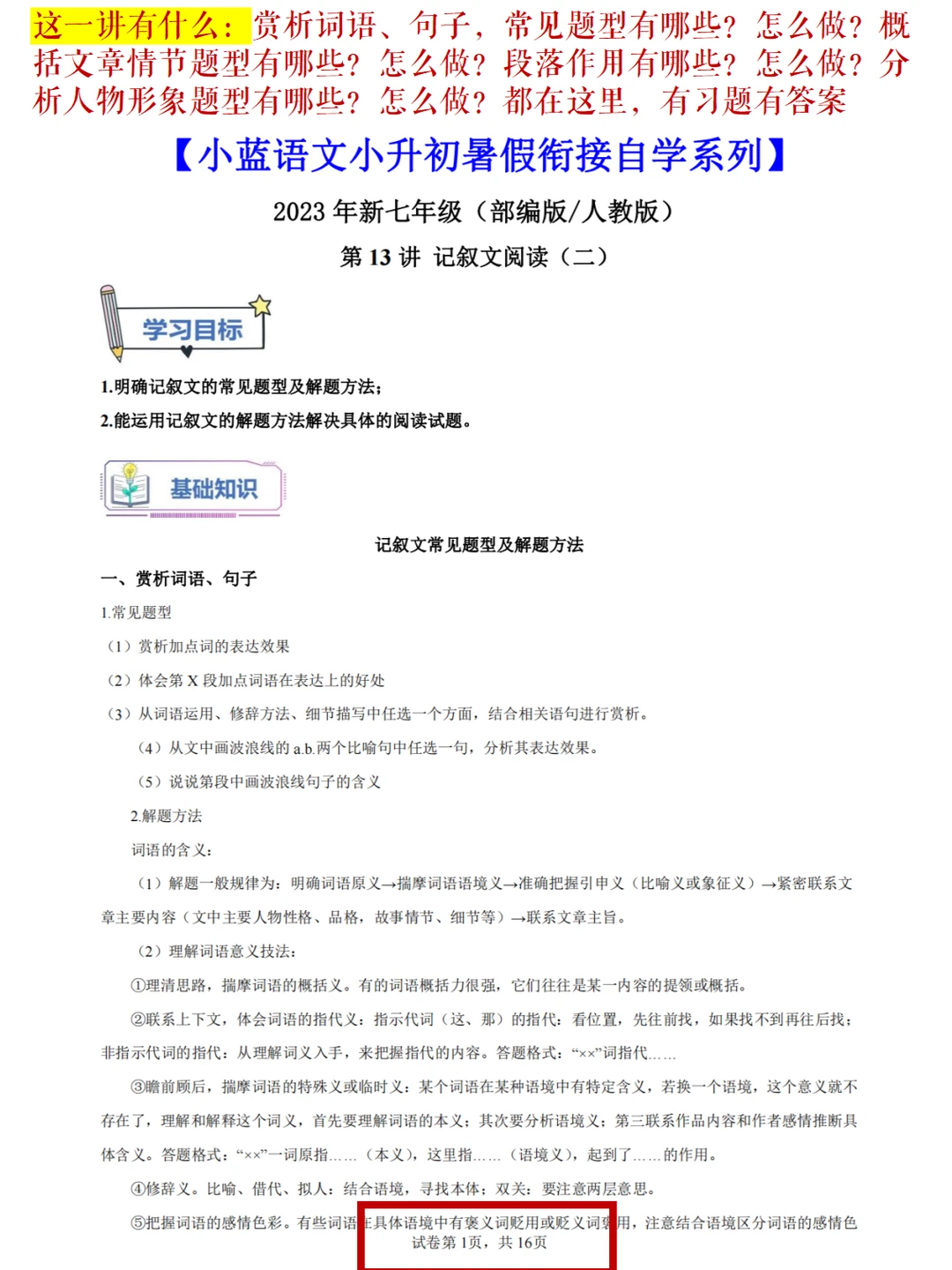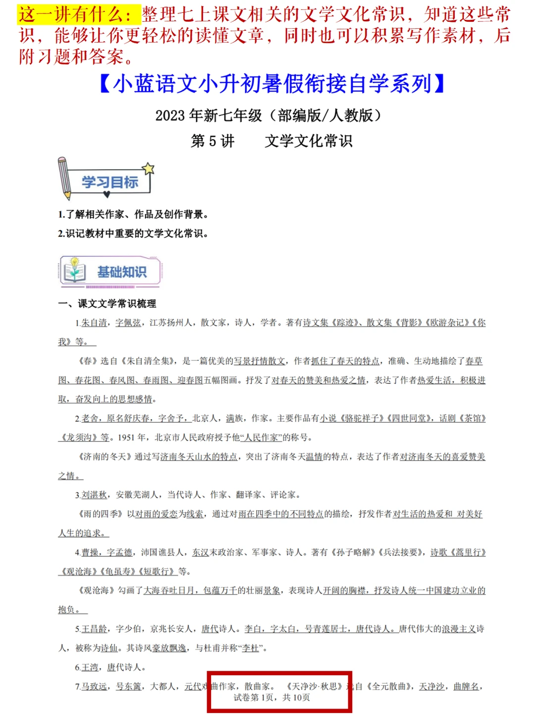 🙏今天,满足你们需求的资料终于来了,这个暑假就认准这一份,每天花1小时时间,先预习七上语文课本里的课文,然后拿出这份资料,找到对应章节,对基础知识进行背诵,完成对应的习题,然后对答案,订正,做好笔记。
