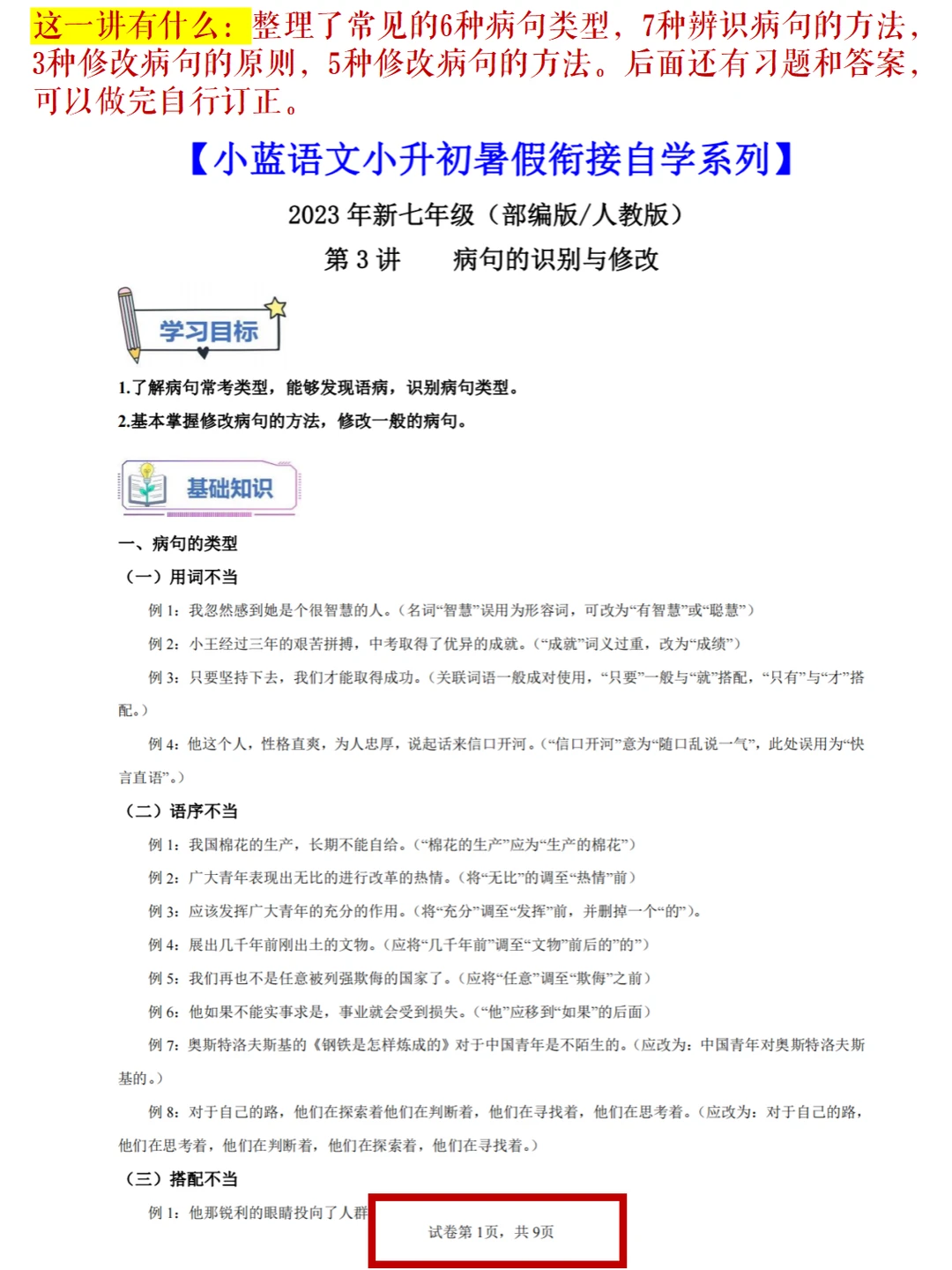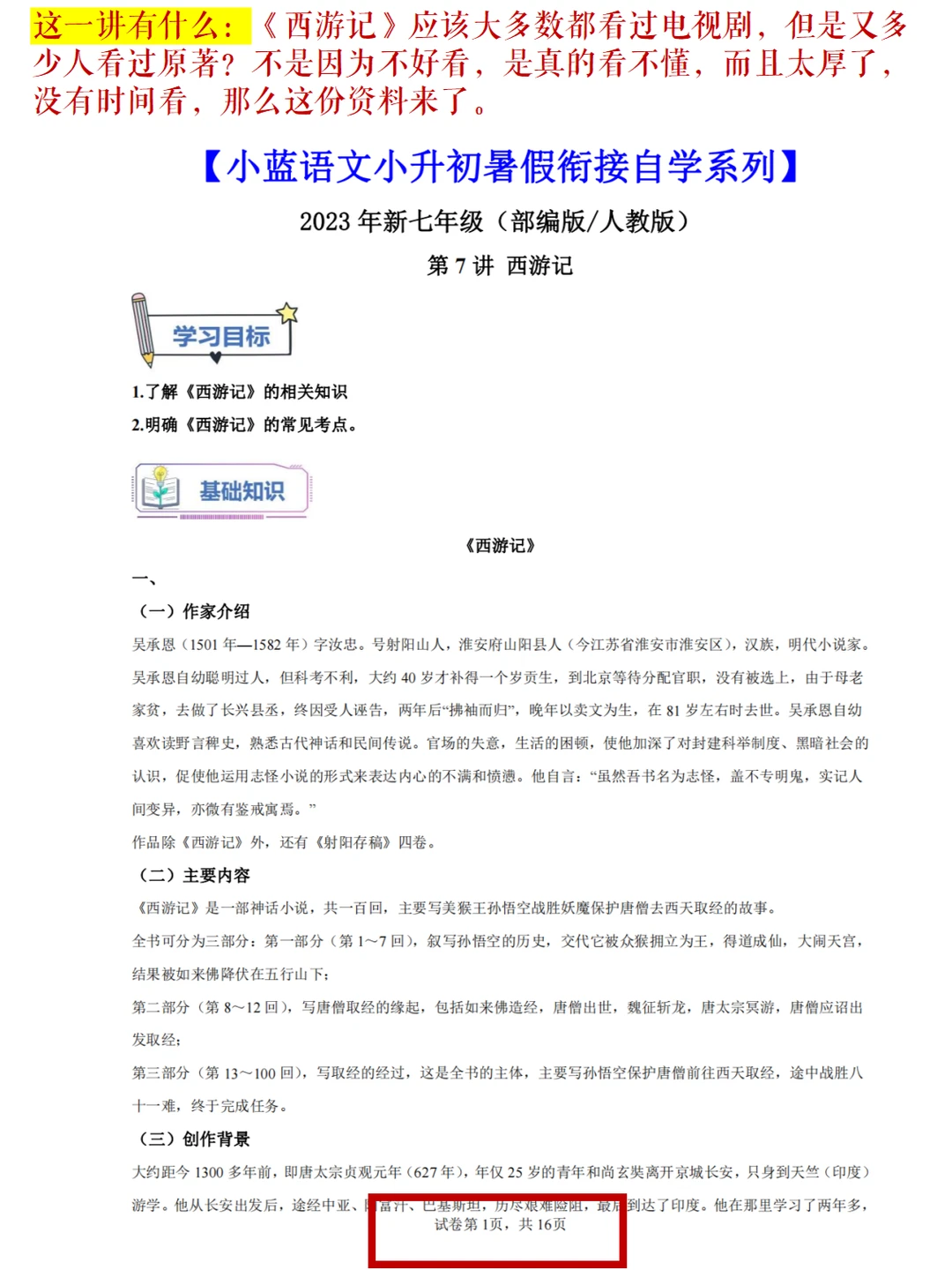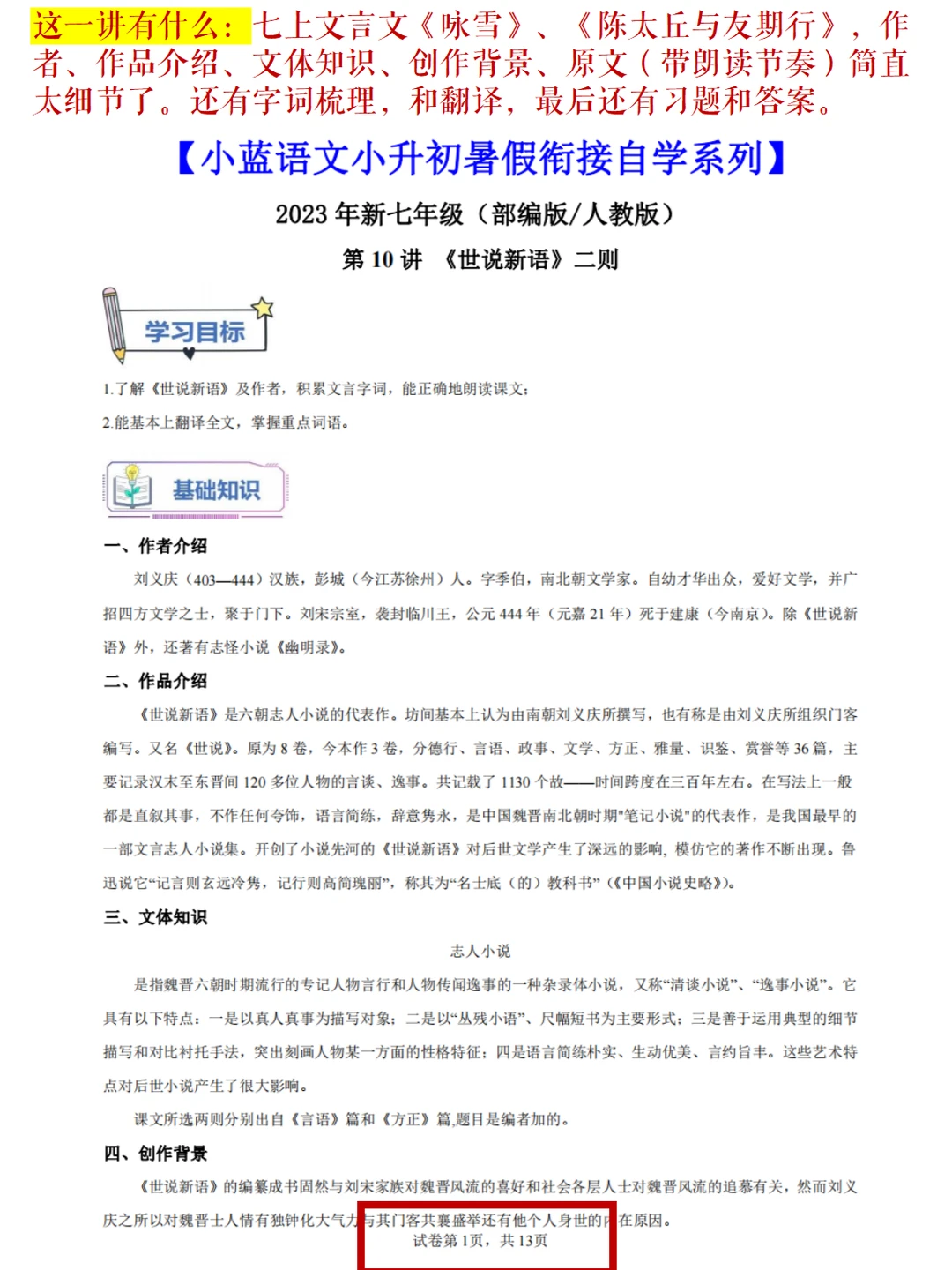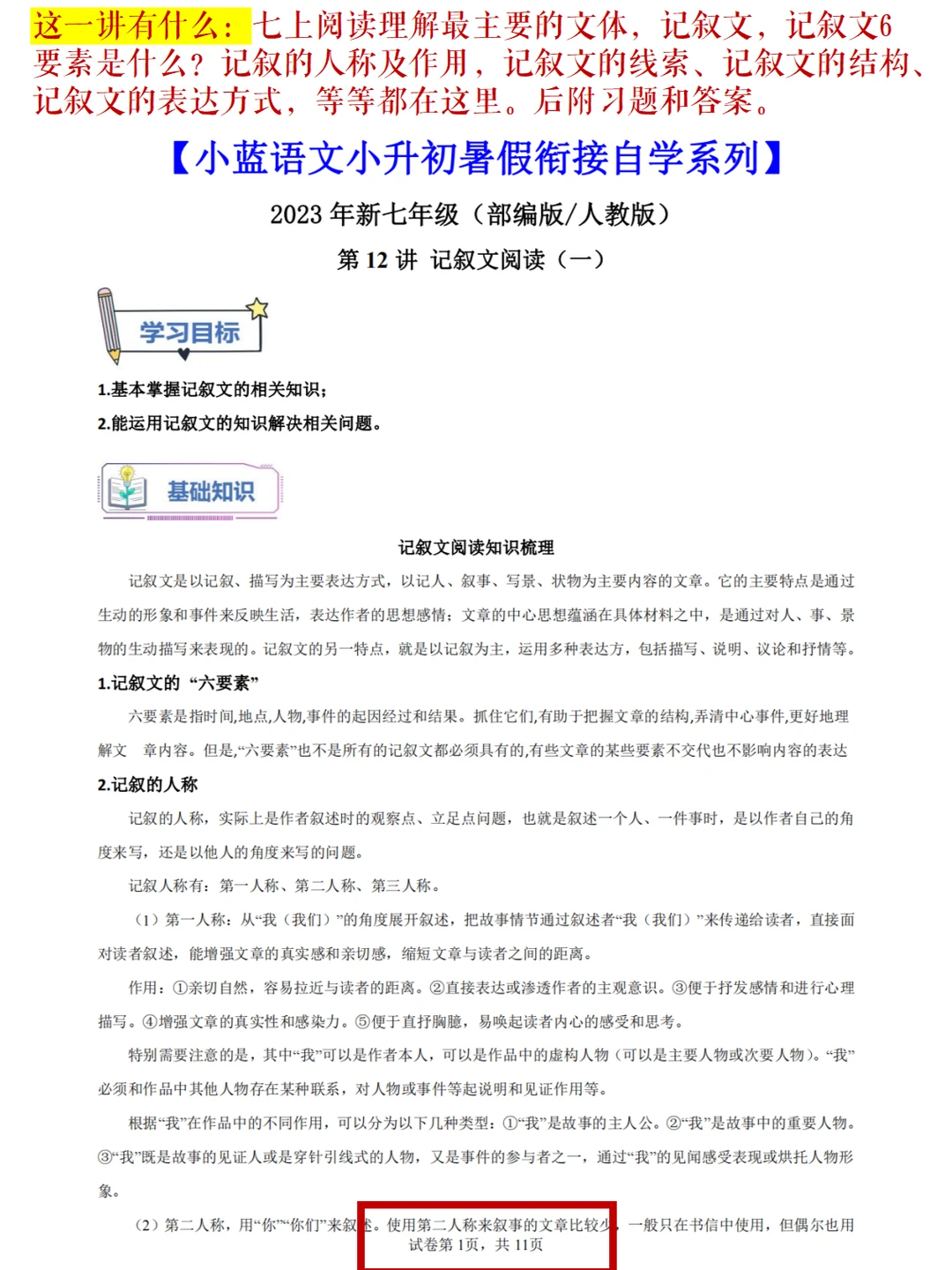 🙏今天,满足你们需求的资料终于来了,这个暑假就认准这一份,每天花1小时时间,先预习七上语文课本里的课文,然后拿出这份资料,找到对应章节,对基础知识进行背诵,完成对应的习题,然后对答案,订正,做好笔记。