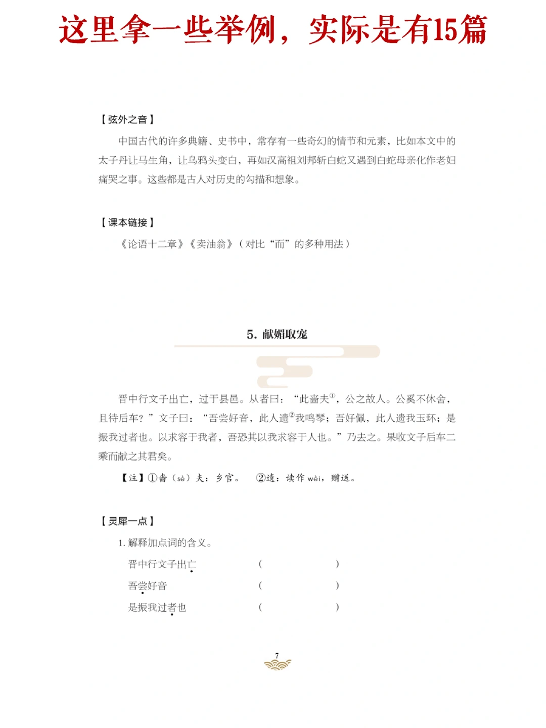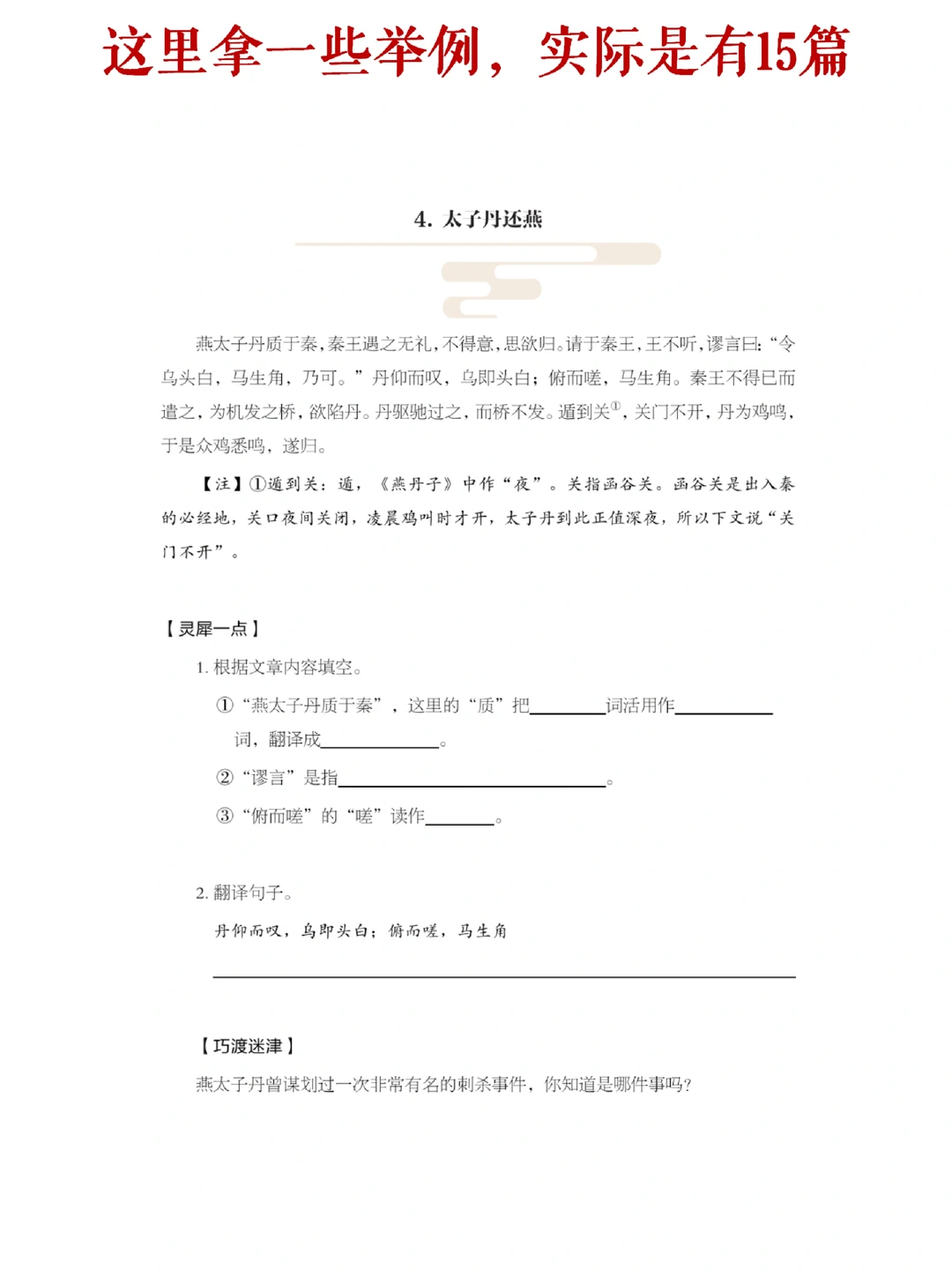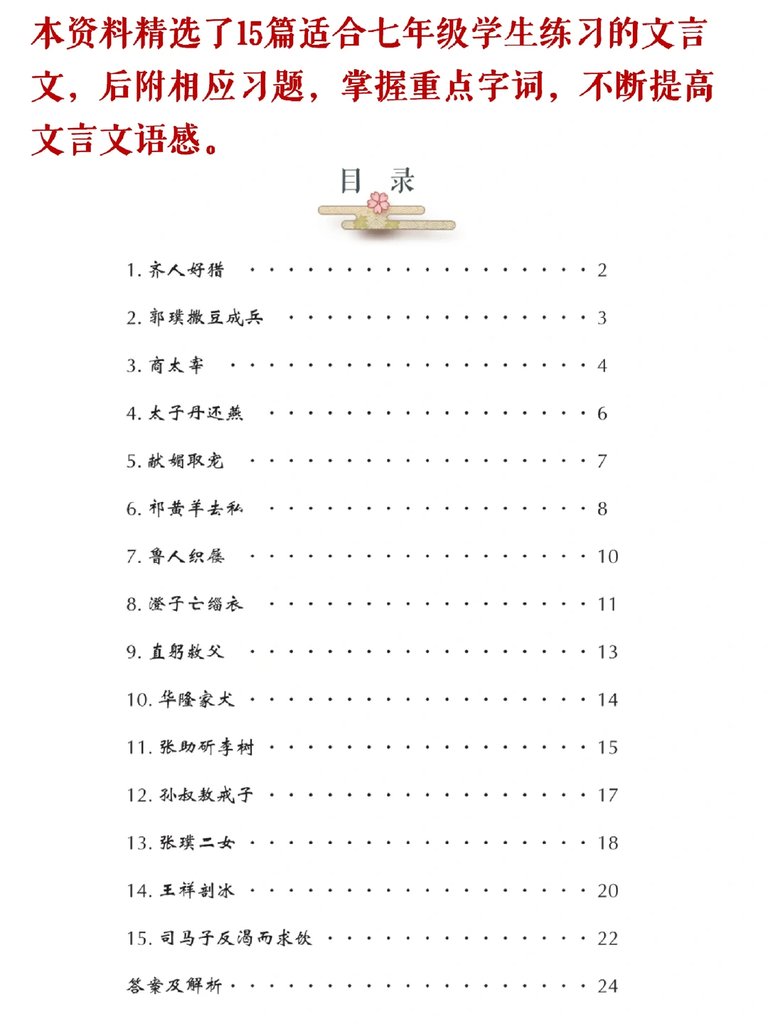[鼓掌R]资料内容:初中课外文言文训练15篇-内含习题、答案。