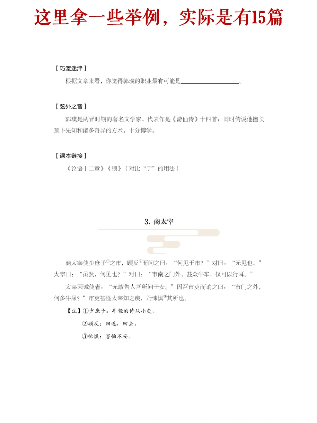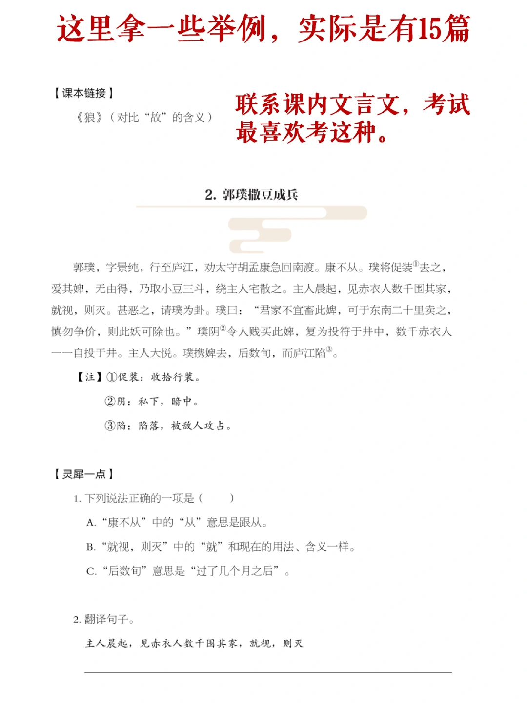 [点赞R]都是中考有考过的,15篇课外文言文训练,课外文言文是初中语文考试的一个重难点,很多学生在这里一分都拿不到,除了要学扎实课内的文言文懂得融会贯通和知识迁移,还要多训练课外文言文,训练自己短时间阅读课外文言文,理解、猜测文意、词句的能力,战胜胆怯心理。