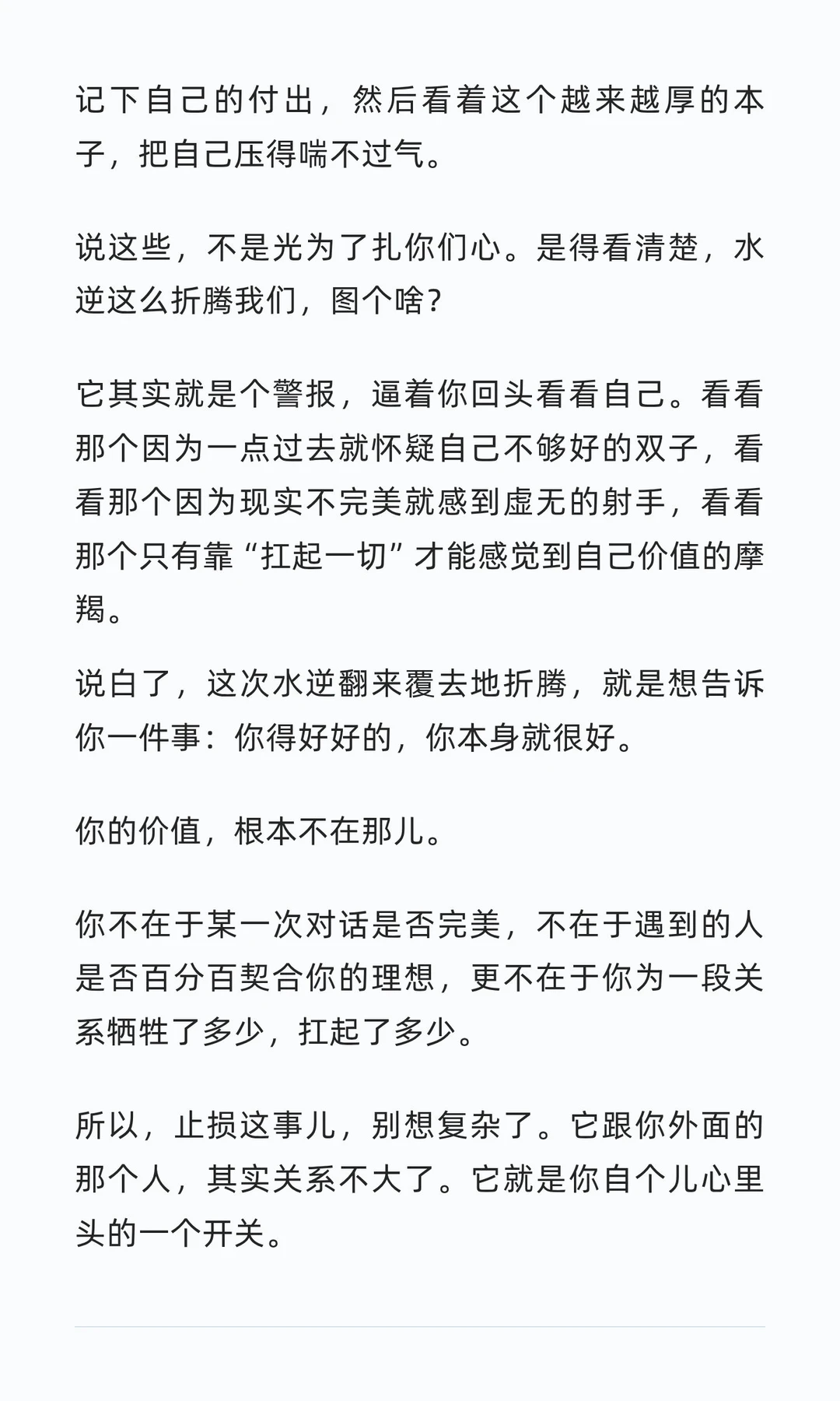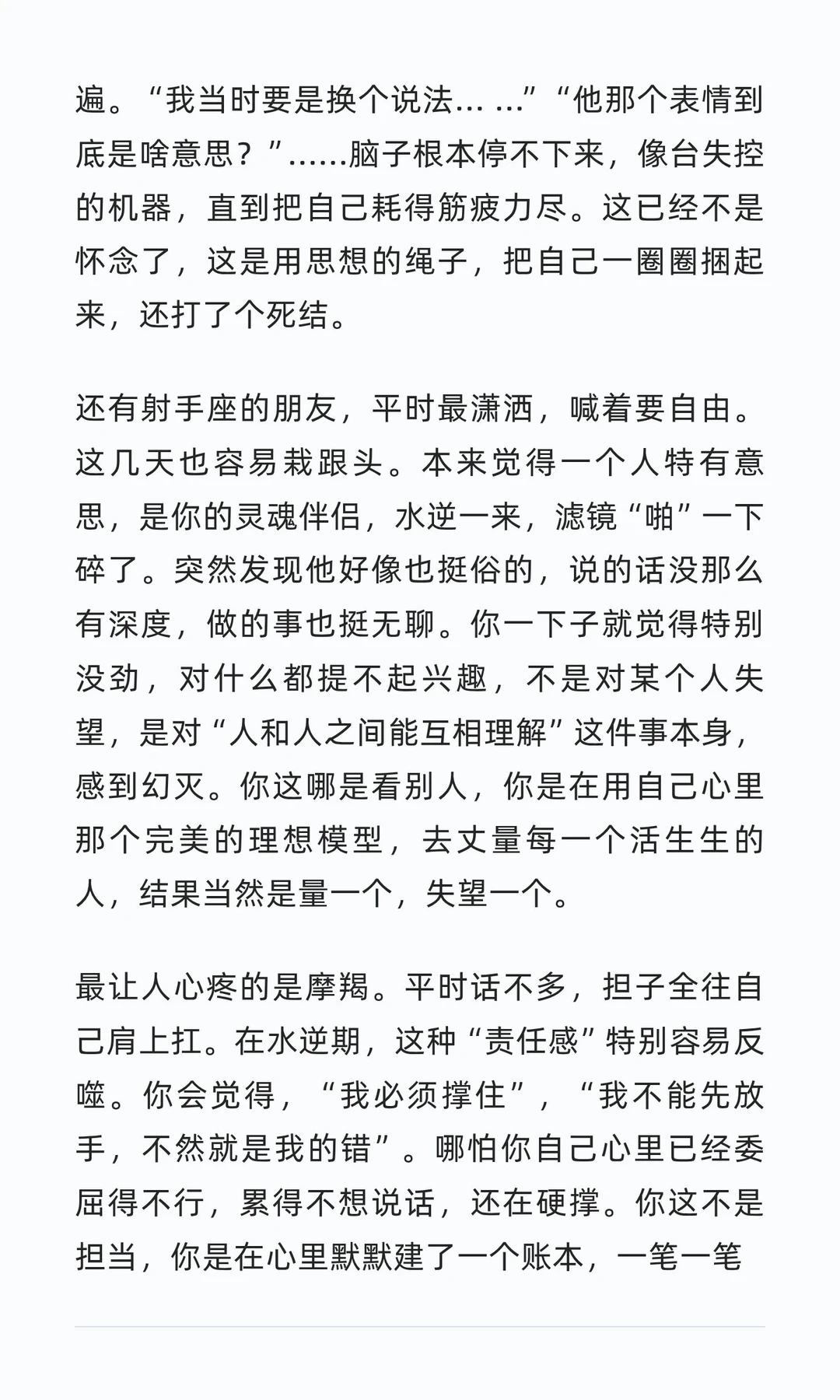 水逆期提醒我们反思自我,避免被过去情绪消耗。双子座、射手座和摩羯座尤其易受其影响,陷入对过去的反复纠结。真正的价值不在他人评价或关系牺牲中,而在于自我接纳与独立。学会放下,专注于当下,才能更好地前行。
