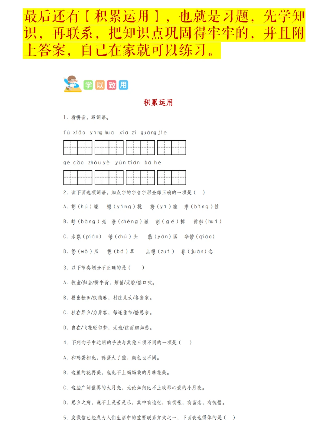 最后还有【积累运用】,也就是习题,先学知识,再联系,把知识点巩固得牢牢的,并且附上答案,自己在家就可以练习。