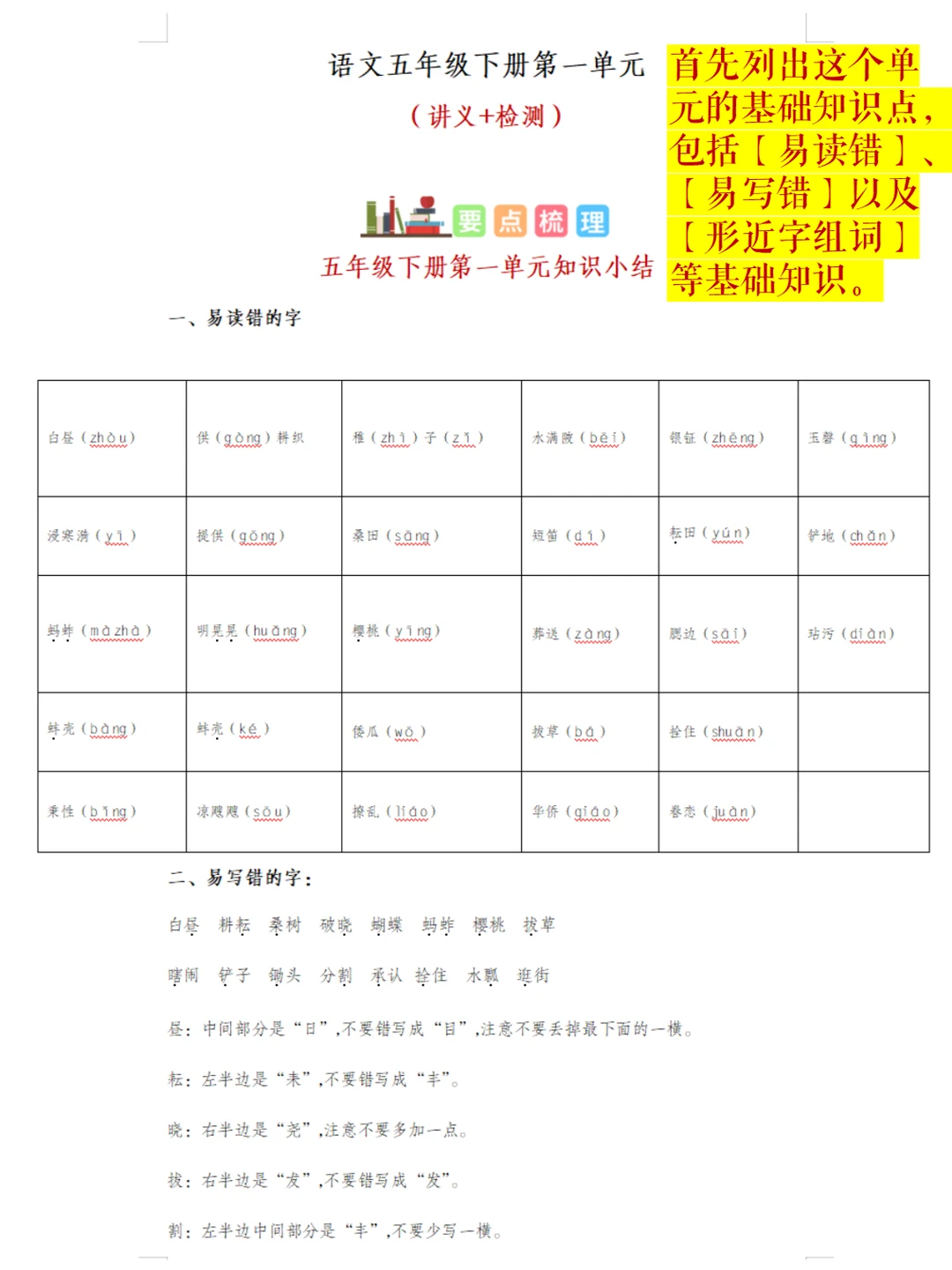 首先列出这个单元的基础知识点,包括【易读错】、【易写错】以及【形近字组词】等基础知识。
