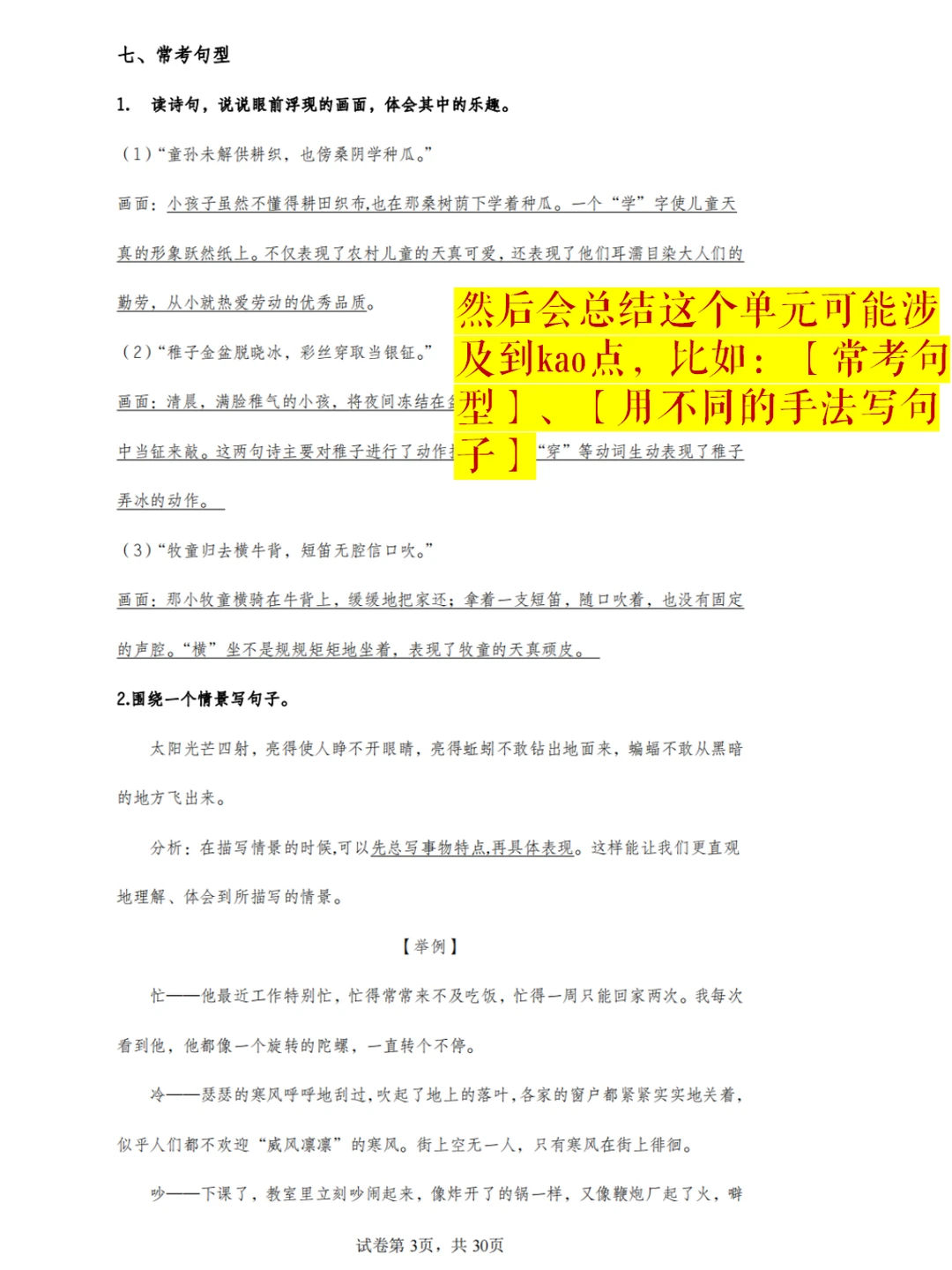 然后会总结这个单元可能涉及到kao点,比如:【常考句型】、【用不同的手法写句子】