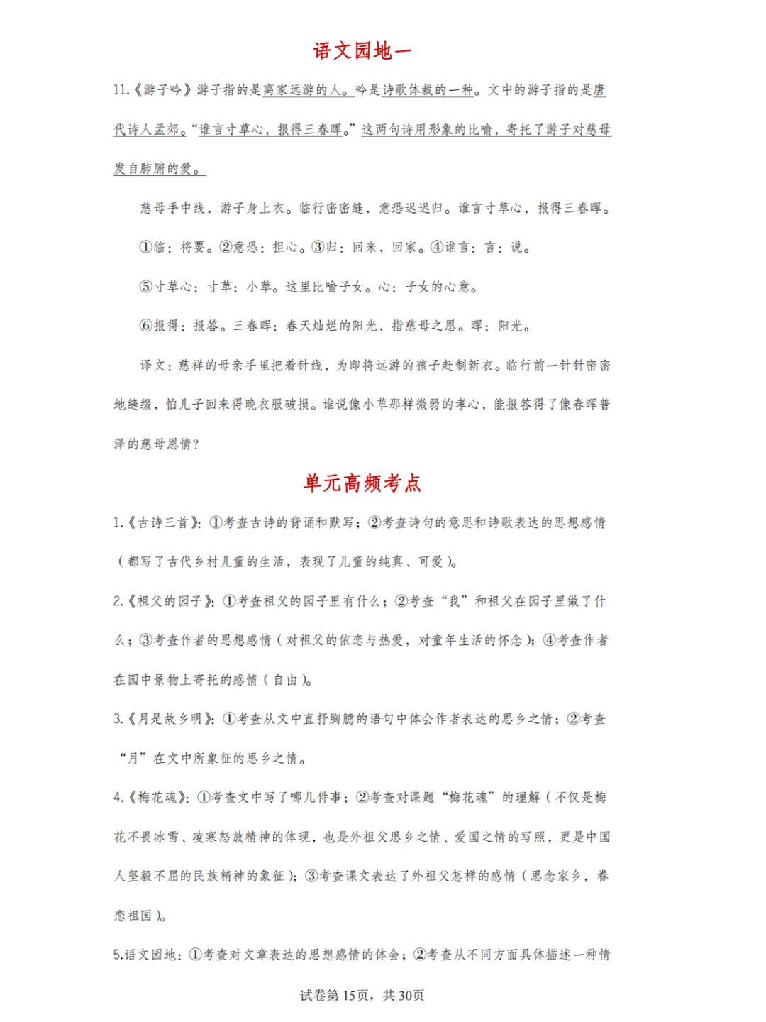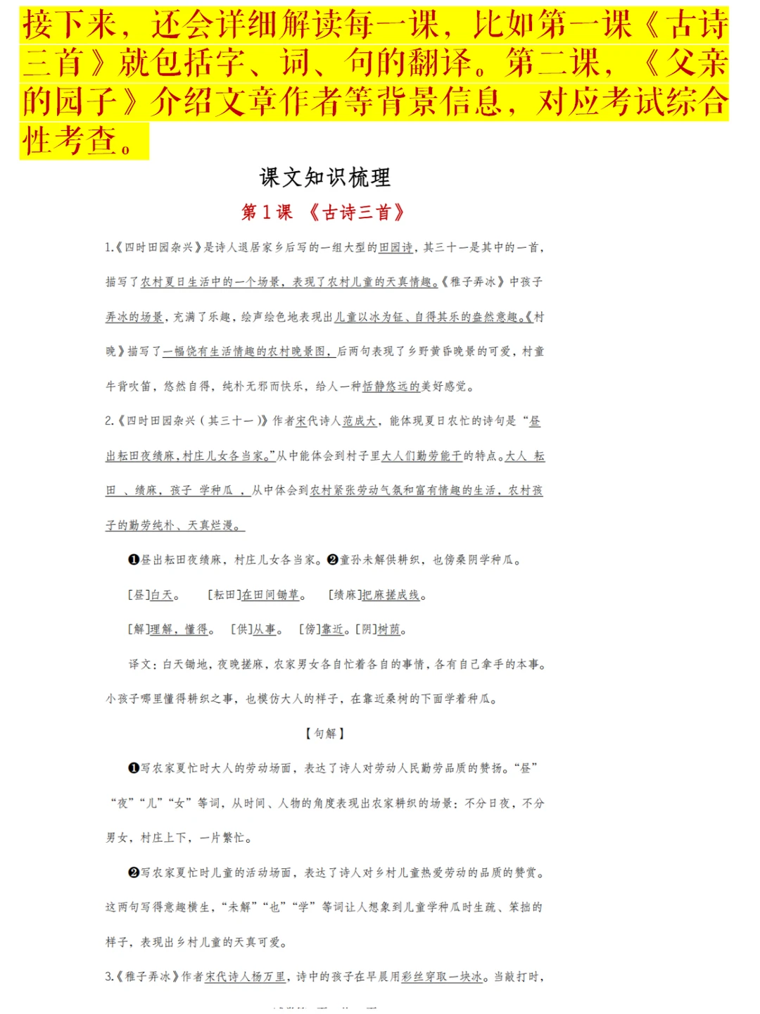 接下来,还会详细解读每一课,比如第一课《古诗三首》就包括字、词、句的翻译。第二课,《父亲的园子》介绍文章作者等背景信息,对应考试综合性考查。