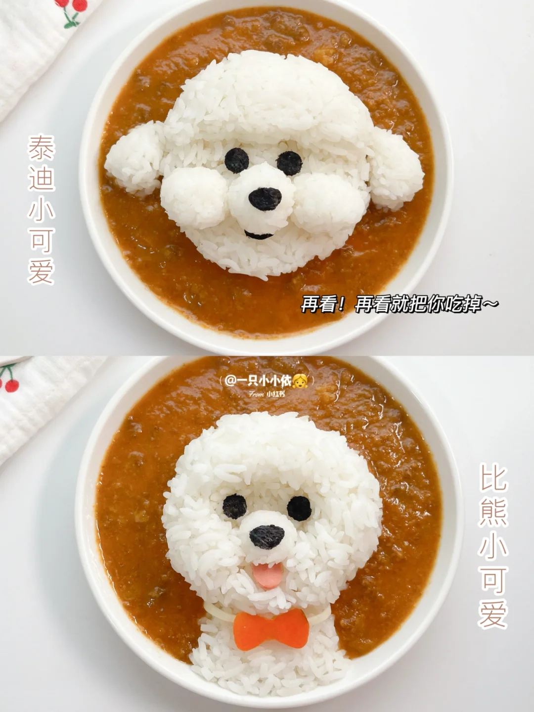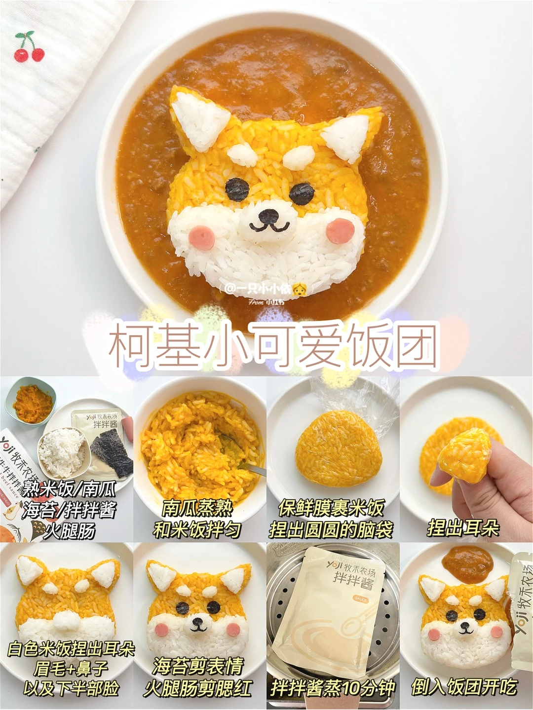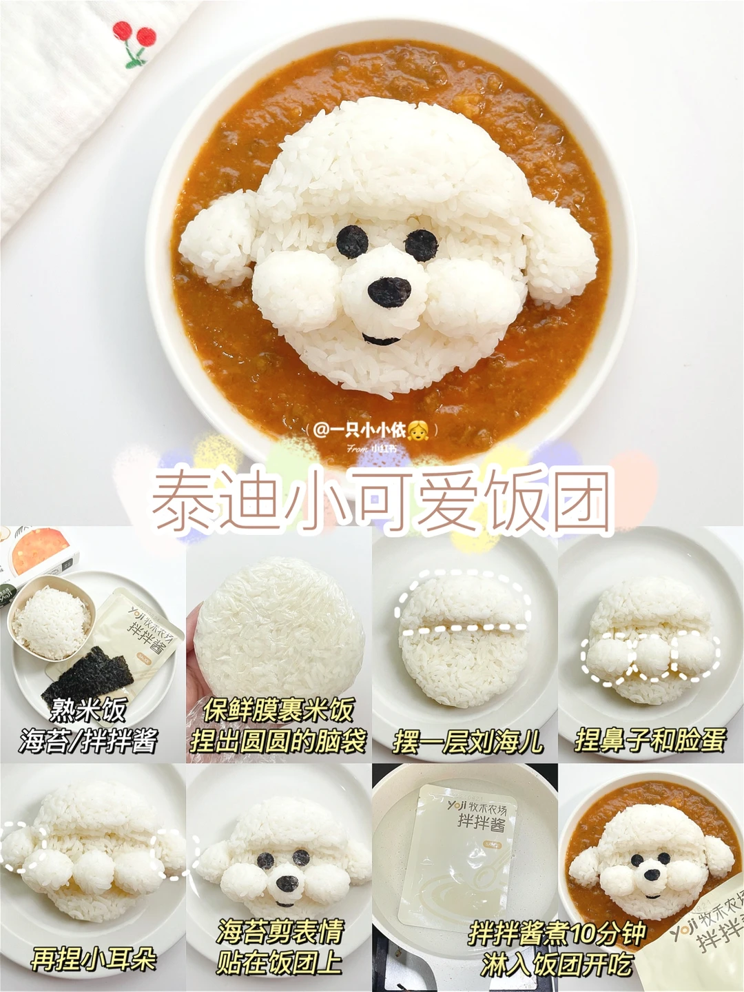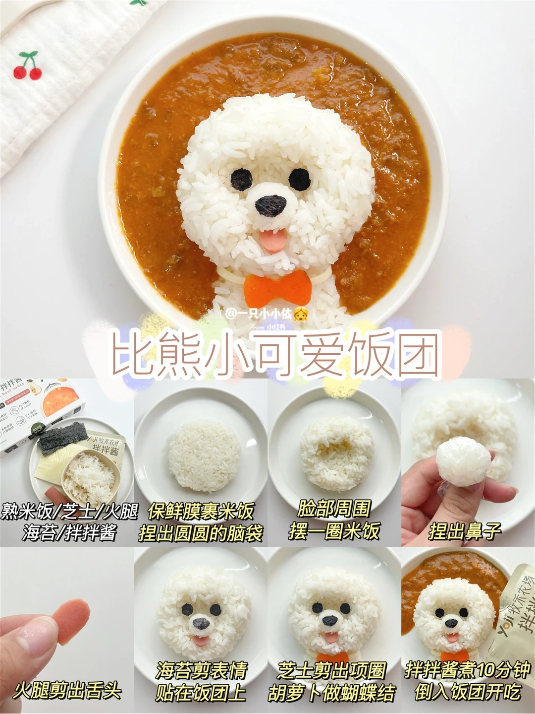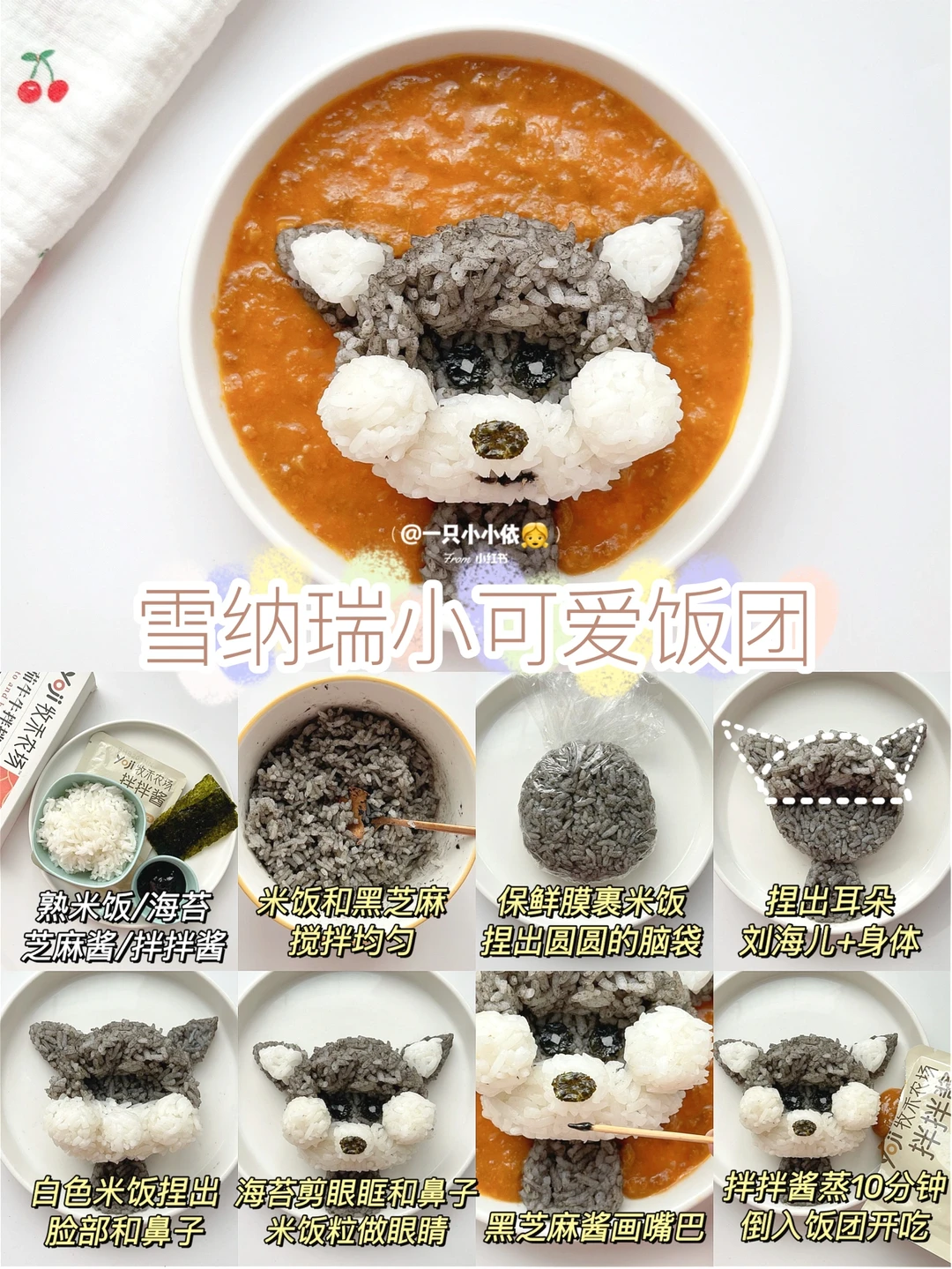 ✨总体来说,狗狗饭团分为脑袋基地+五官表情,五官中鼻子和脸蛋比较高,嘴巴眼睛比较低,大家掌握好高低关系就能做出立体饭团啦;