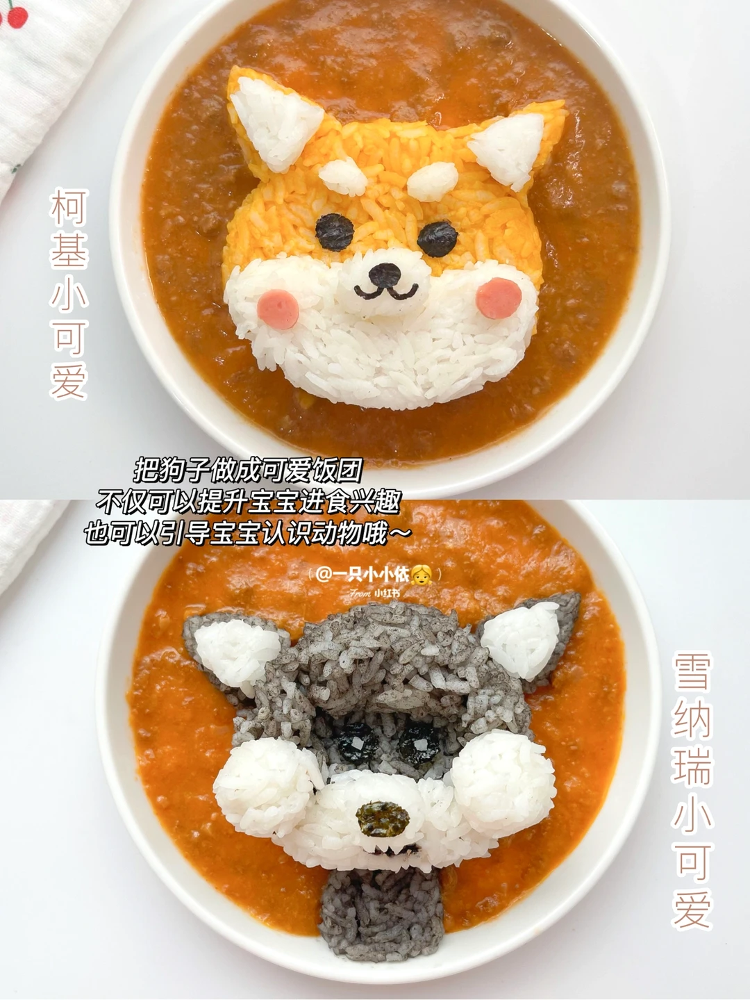 [大笑R]无需模具、有手就会😎把比熊、泰迪、柯基、雪纳瑞四只小可爱,做成宝宝创意饭团,不仅可以刺激宝宝进食兴趣,也可以顺便教宝宝认识小动物哦👏🏻再配上香喷喷超有料的拌拌酱,轻松搞定一顿辅食大餐🍲