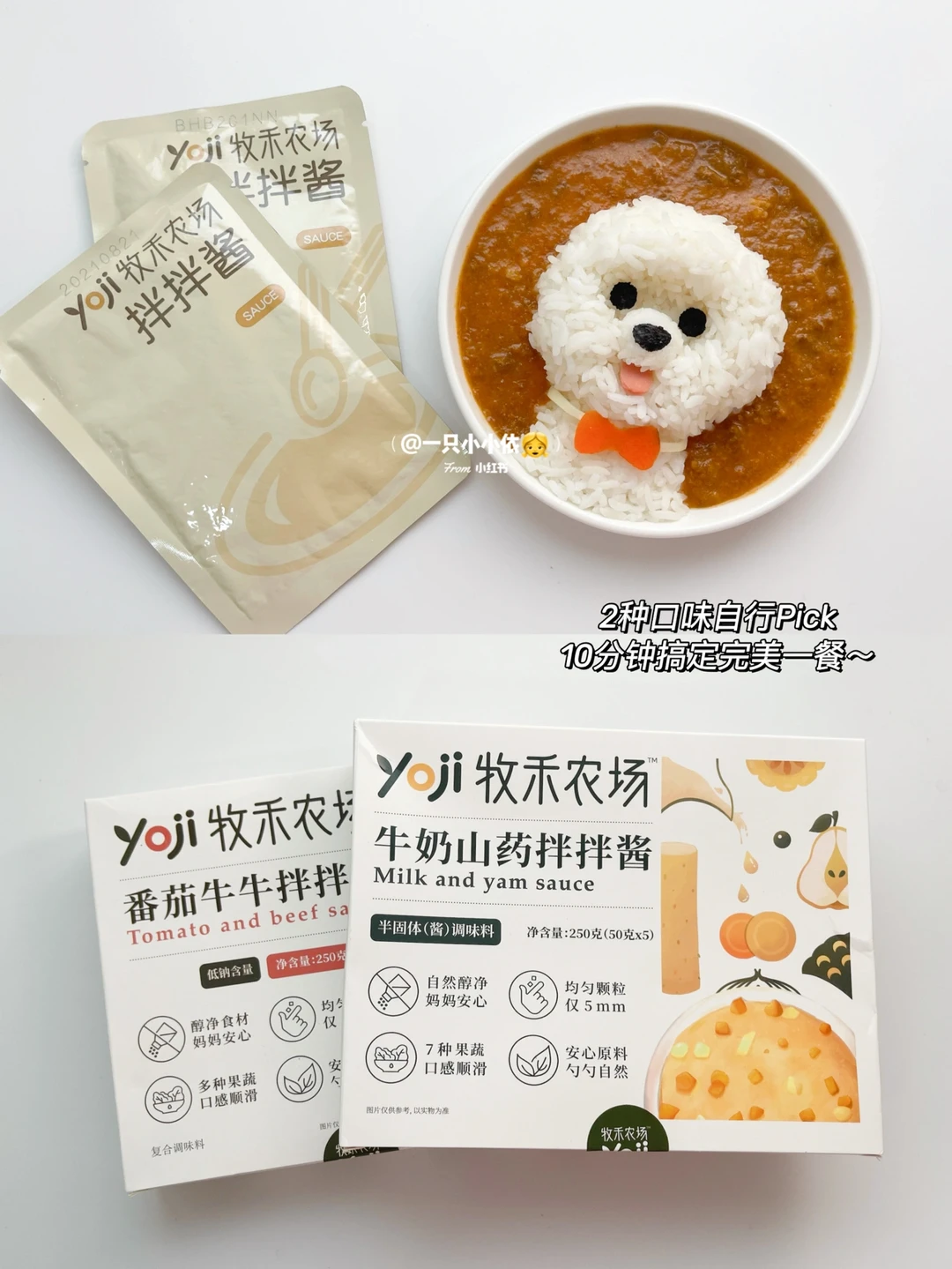 超可爱萌宠饭团,搭配香喷喷的拌拌酱更下饭哦!牧禾农场拌拌酱,有番茄牛牛和牛奶山药2种口味,来不及准备午晚餐时,拿出一袋蒸或煮10分钟就搞定!营养美味又健康[偷笑R]