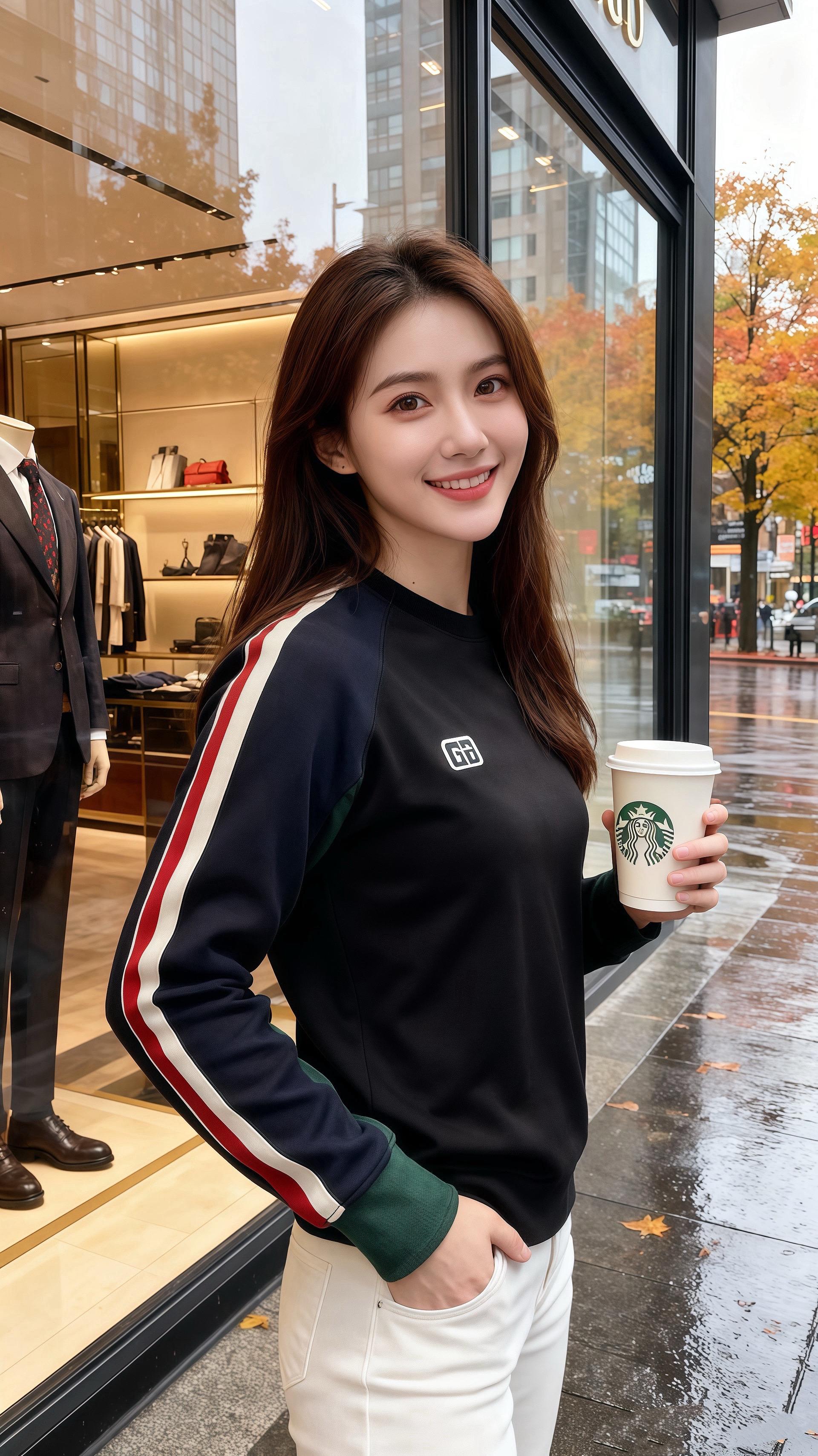 她身上的黑底拼色卫衣衬得秋意都鲜活——面料看着软和,袖边的红白条纹添了点轻快,胸口的小标不张扬,配着白裤,松弛里裹着温温的质感。