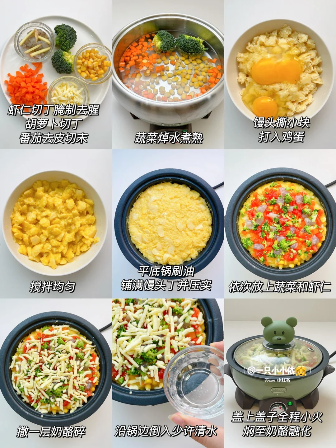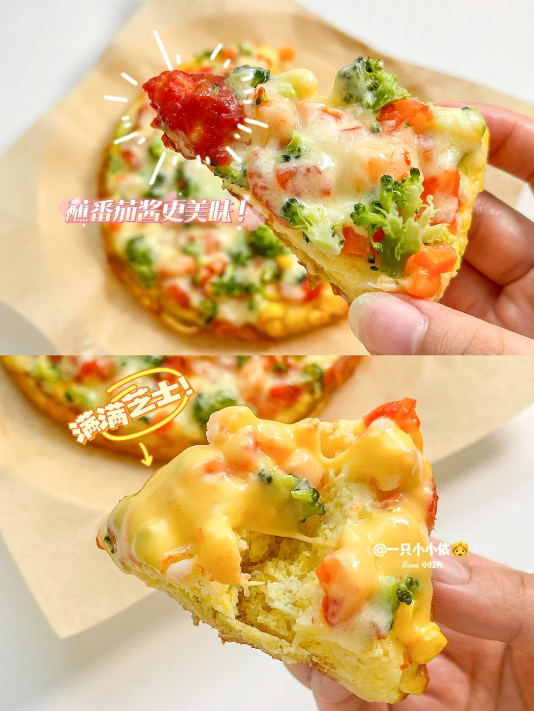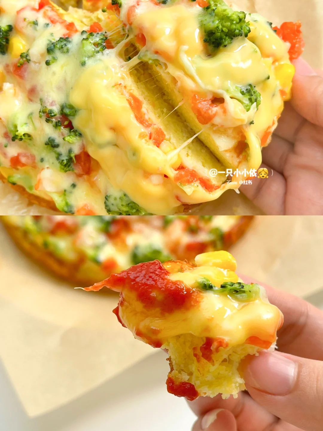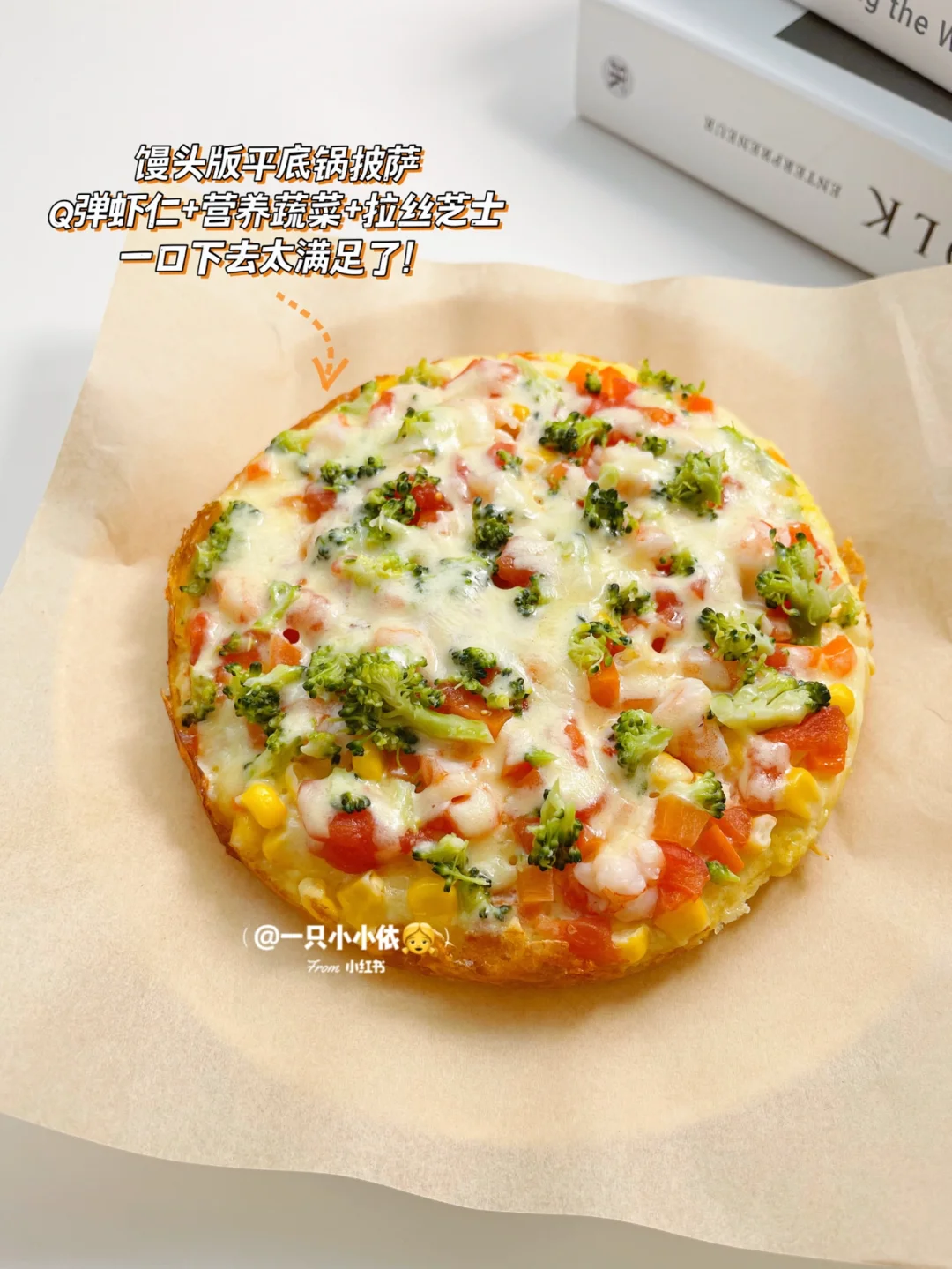 👉用馒头代替传统饼皮,方便更健康,撒上营养丰富的鲜虾和各种配菜,再被浓郁芝士包裹,芝香满满、补钙补维生素,太满足啦👏🏻依依现在都会点名要我做披萨了哈哈!