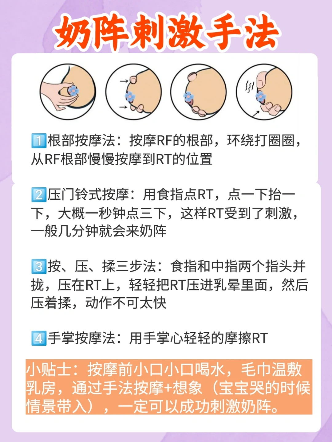 ④学会刺激奶阵可以有效提高吸奶器使用效率,可手动刺激,也可选择带有按摩功能的吸奶器,模拟宝宝吮吸状态,从而达到产奶效果。