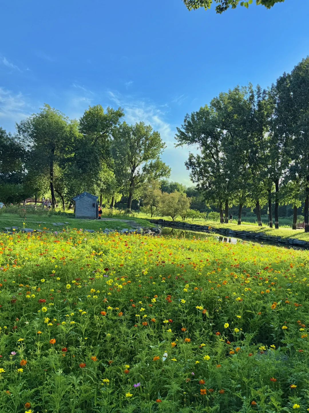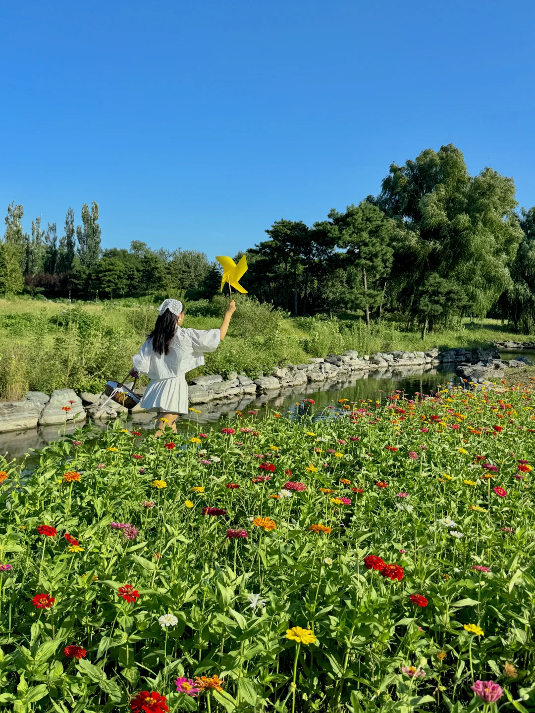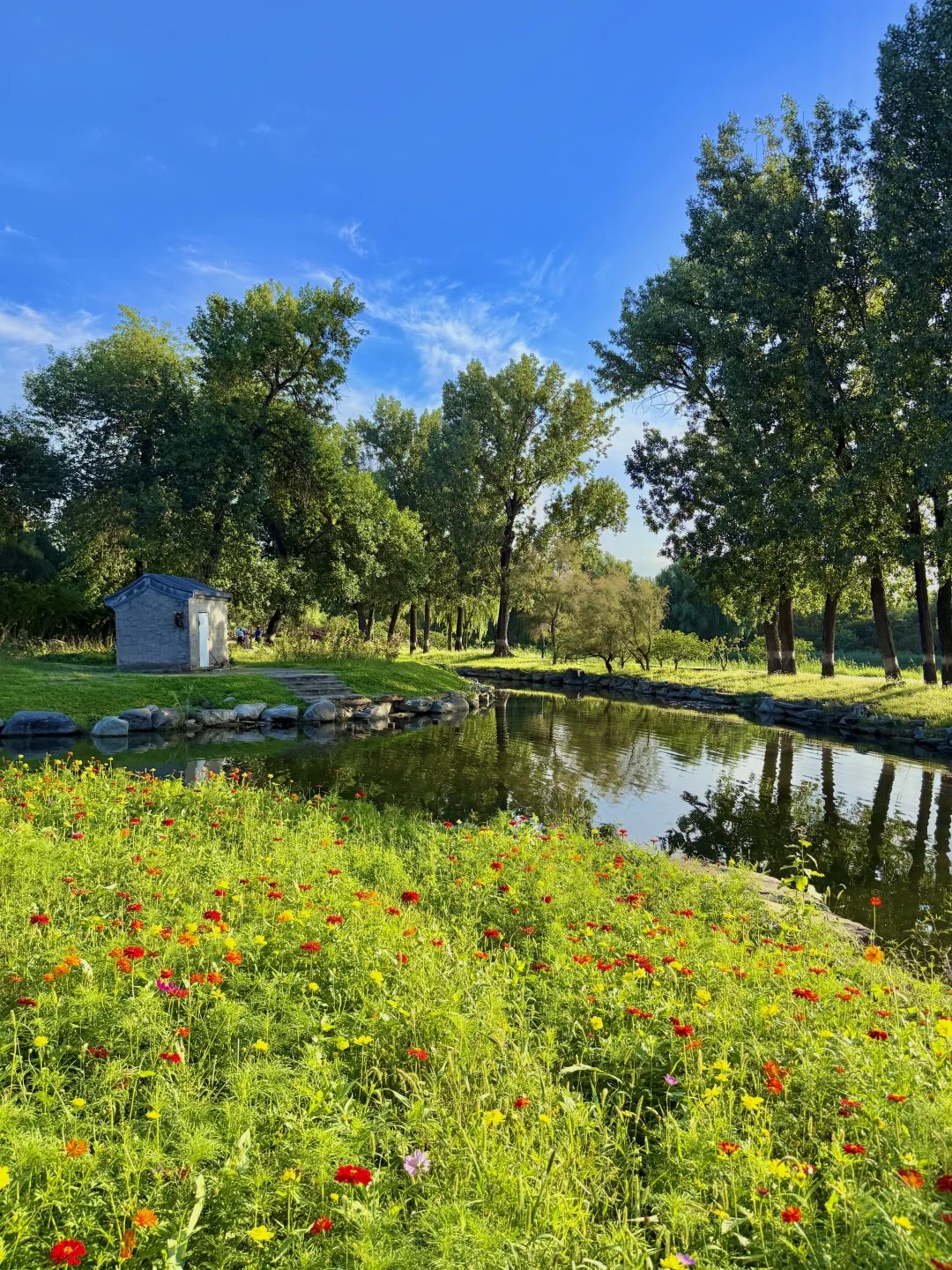 ✅三号机位:这一处距离前两处比较远,🌼如果想直冲这边花海的直接🧭导航“北京奥运纪念林,右侧(地图上右侧👉)可以看到标志性红色桥和岸边的小房子,🗺️图1位置就在这里了🎨
