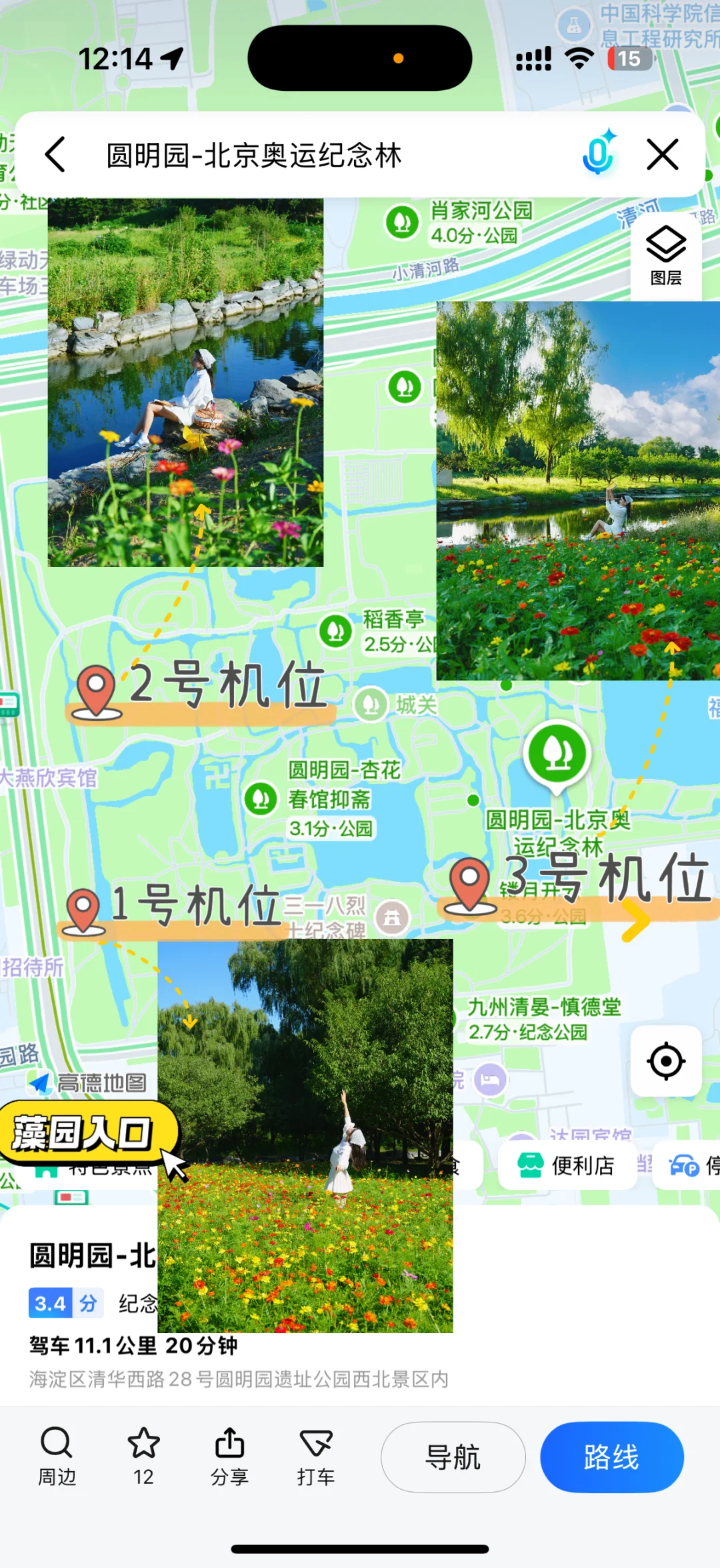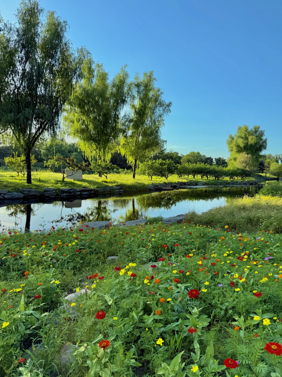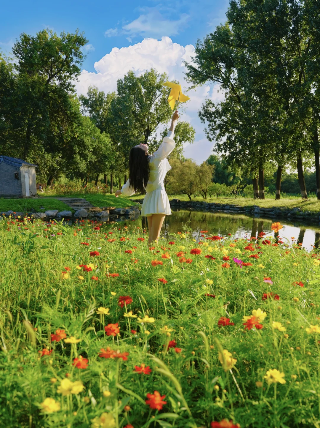 ✅三号机位:这一处距离前两处比较远,🌼如果想直冲这边花海的直接🧭导航“北京奥运纪念林,右侧(地图上右侧👉)可以看到标志性红色桥和岸边的小房子,🗺️图1位置就在这里了🎨