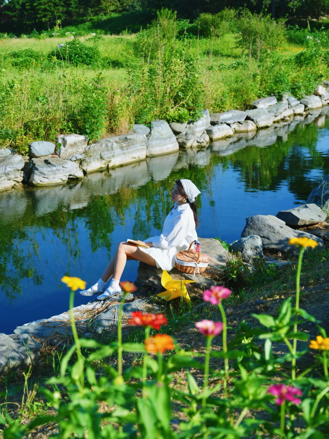 ✅二号机位:继续沿着这条路主路直行约500m可以看到,下一片花海🌼也是在一条河边🔆个人觉得长势不如其他两个🗺️但是可以人物坐在岸边岩石上,用前面的花做前景2x拍摄,出来的效果也不错🤳