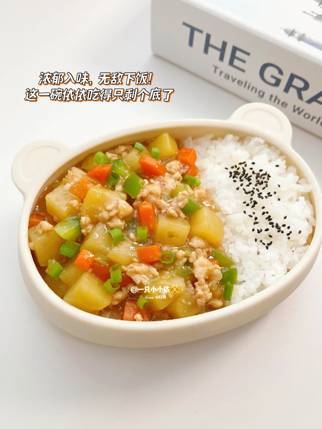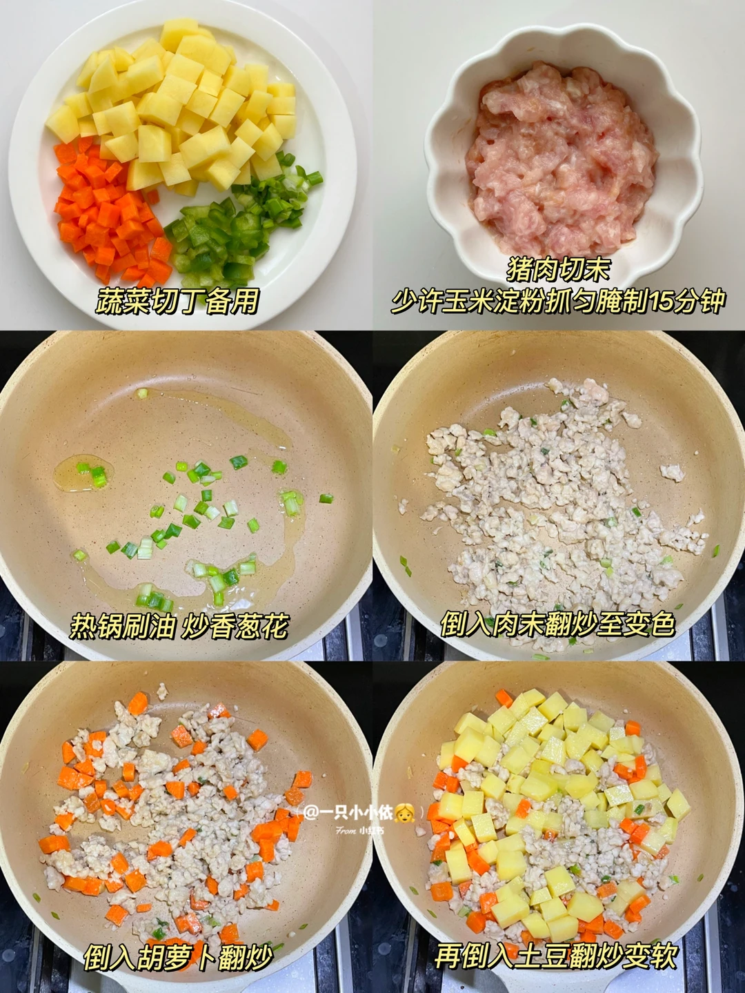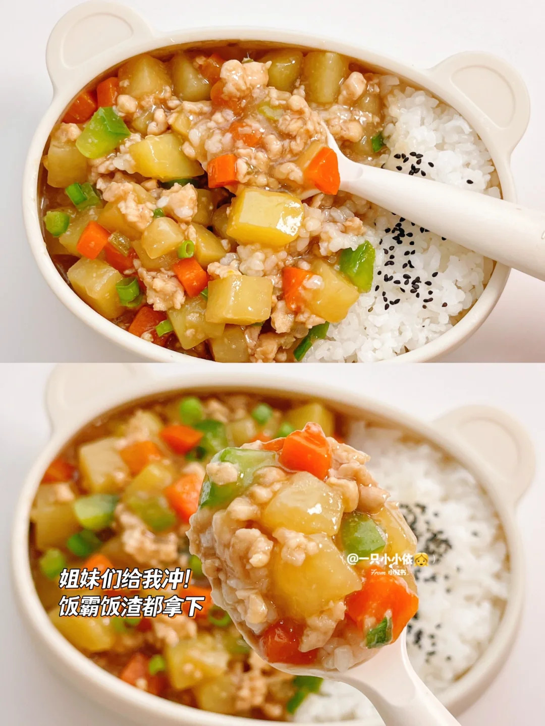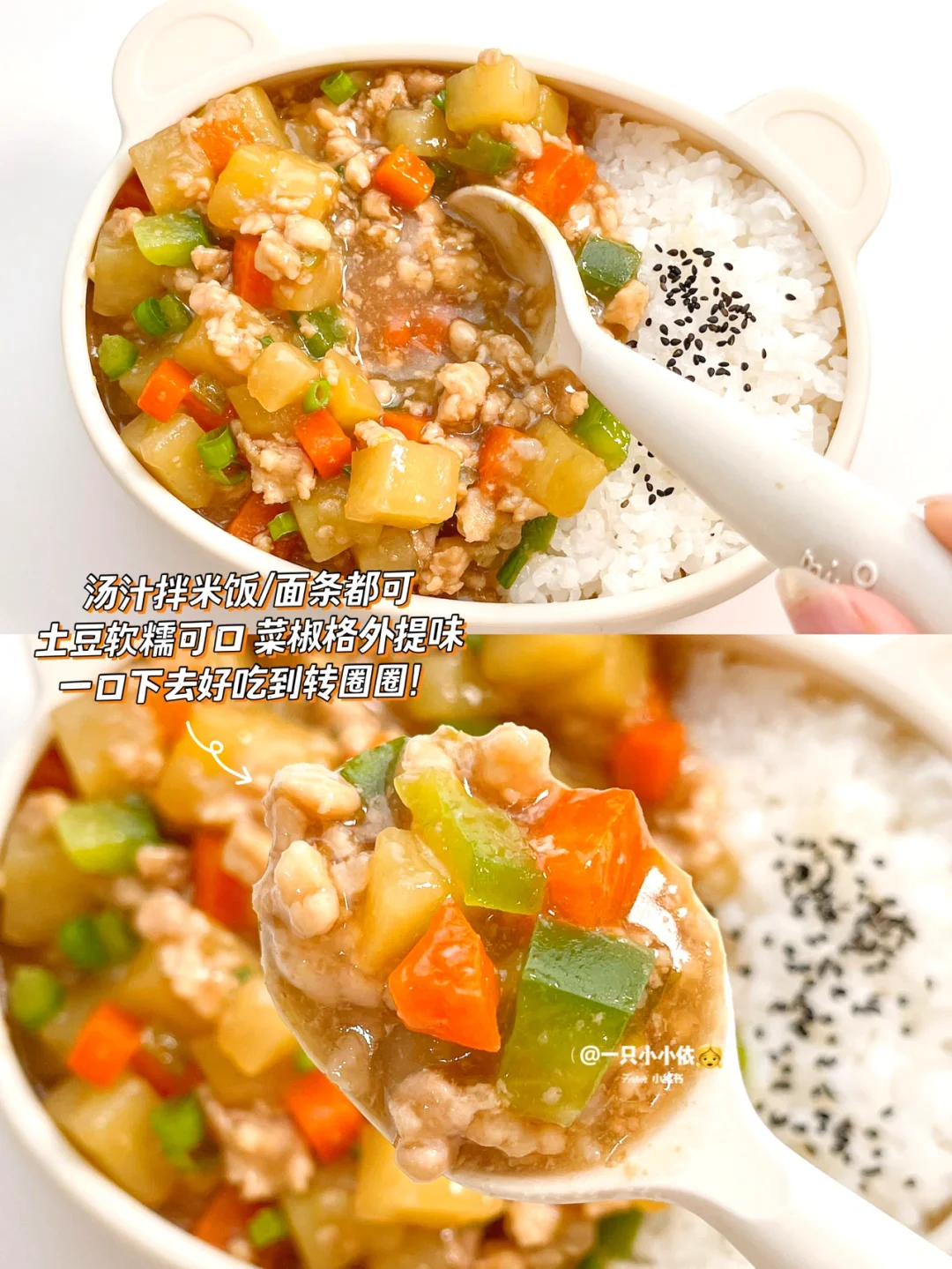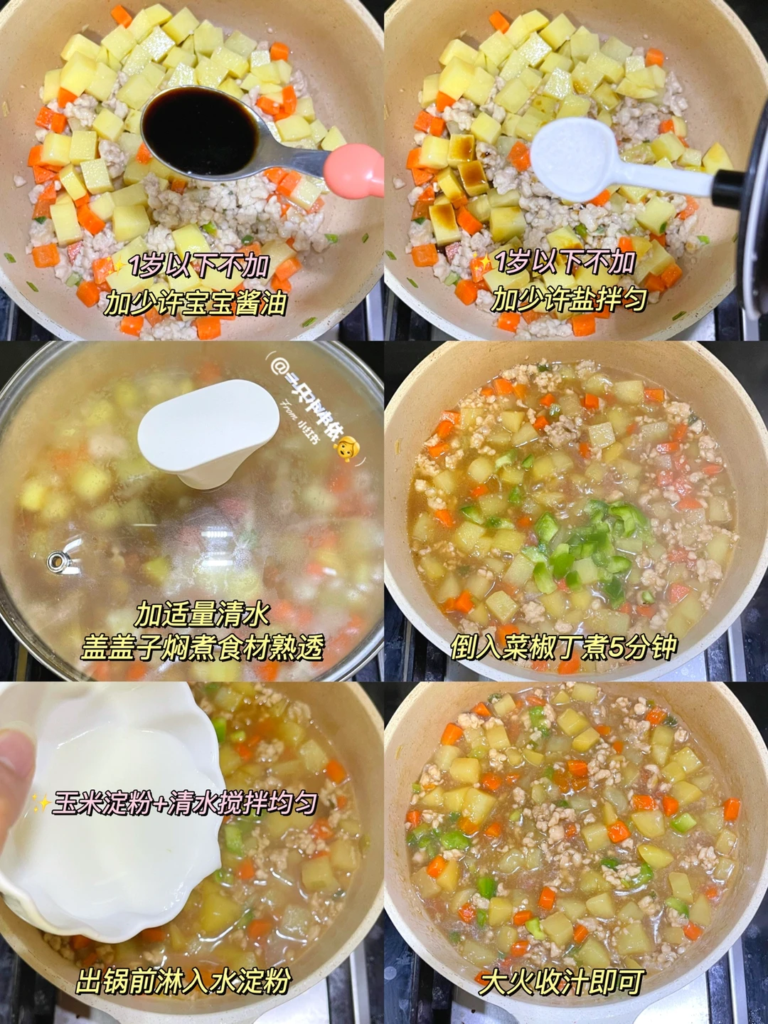 💁‍♀️今天是快手家常的光盘系列,好吃到舔盘的肉末土豆拌饭,饭霸饭渣统统拿下! 🧚‍♀️肉沫软嫩、土豆软糯、汤汁入味,无论是拌米饭还是面条都绝了[赞R]食材常见做法简单,肉菜搭配营养均衡[大笑R] · ✨1岁以下不放调料 ✨食材大小根据宝宝咀嚼能力处理 ✨猪肉用里脊部分更嫩哦 · 🌈食材准备—— 🔸猪里脊 🔹土豆 🔸胡萝卜 🔹菜椒 🔸小葱 · 🌈制作步骤—— 1⃣️蔬菜切丁,猪肉切沫,加少许玉米淀粉抓匀腌制15分钟; 2⃣️热锅刷油,炒香葱花,倒入肉沫翻炒至变色,再倒入胡萝卜、土豆翻炒变软,加少许宝宝酱油和盐搅拌均匀; 3⃣️锅中倒入适量清水,焖煮食材熟透,再倒入菜椒丁煮5分钟,出锅前淋入水淀粉,大火收汁即可✅ · ✨记得用里脊啊朋友们,软嫩鲜香更入味! ✨好吃到爆的土豆肉末拌饭,快整起来! ✨双击屏幕随时抄作业,下期见~