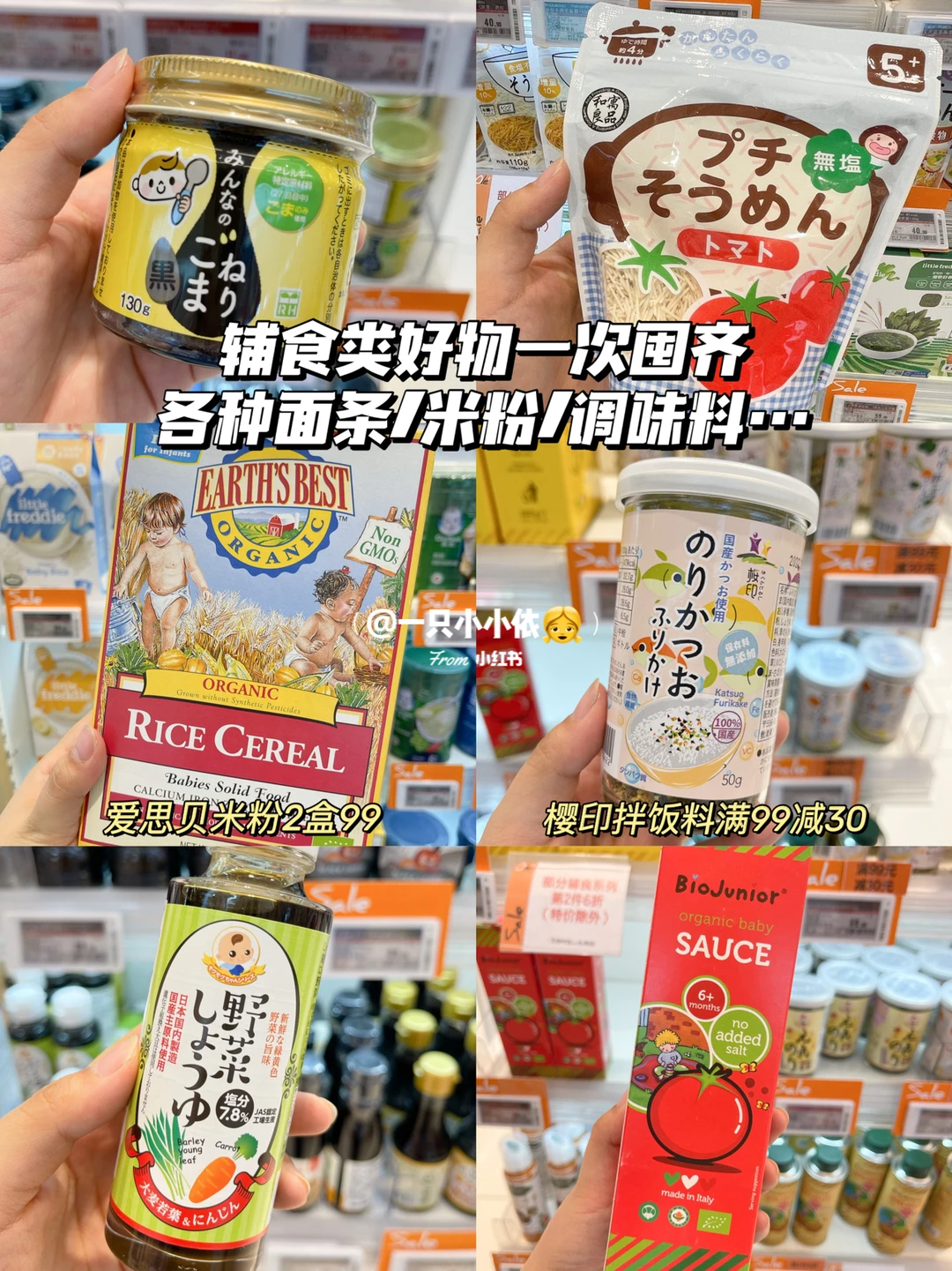✨辅食区是我比较爱逛的啦,有些平常不好入的进口面条、调味料这里都有✅像樱印海苔鸡蛋拌饭料满99减30,爱思贝米粉2盒99,非常适合刚添加辅食的小宝宝~