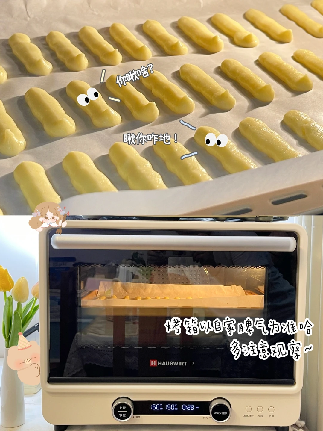 2⃣️烤盘铺油纸,裱花袋剪一个小口子,在烤盘上均匀挤出小条条;