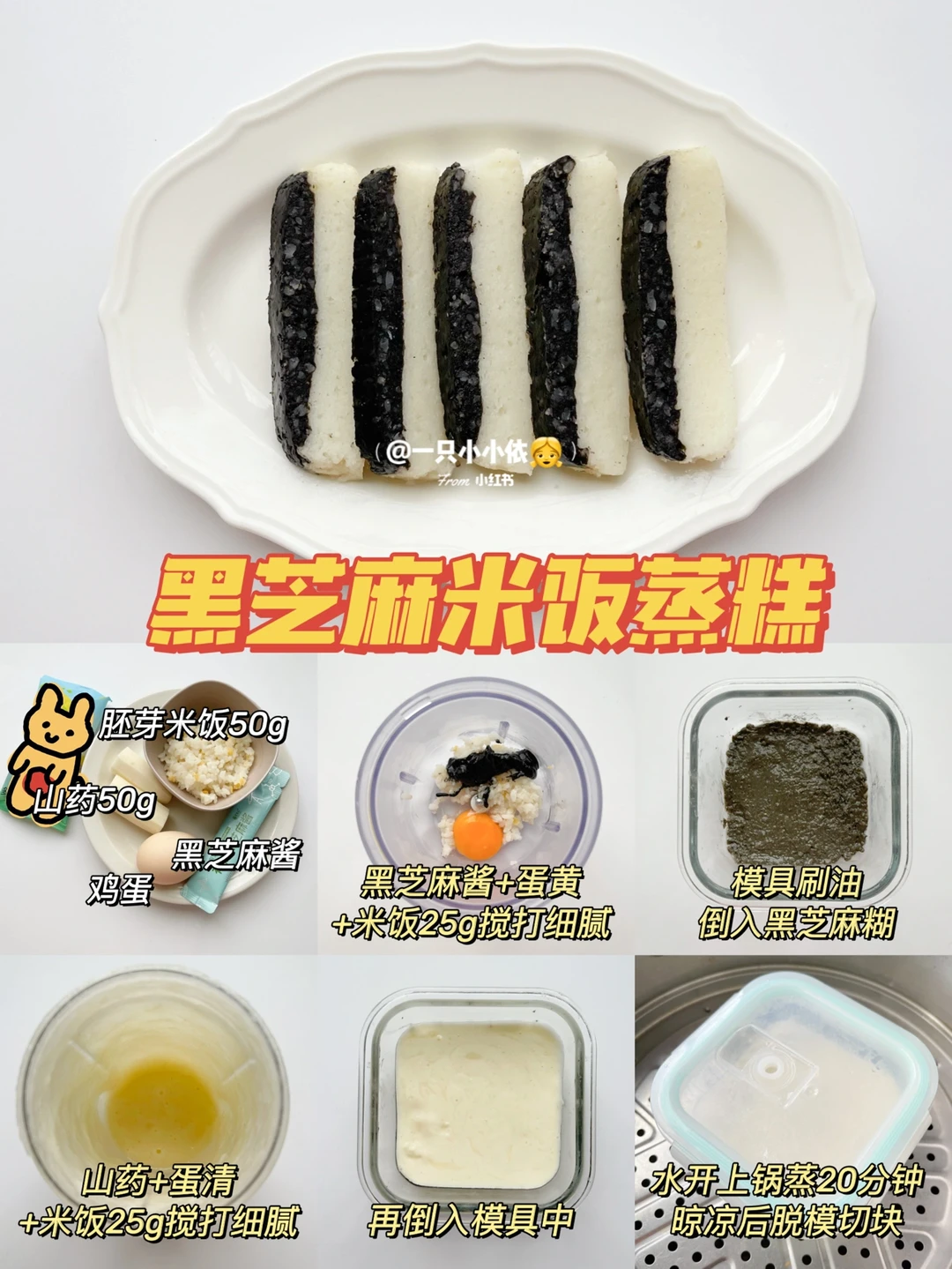 🔹步骤:①黑芝麻酱+蛋黄+米饭25g搅打细腻;②模具刷油,倒入黑芝麻糊;③山药+蛋清+米饭25g搅打细腻,再倒入模具中;④盖盖子水开蒸20分钟,晾凉后脱模切块