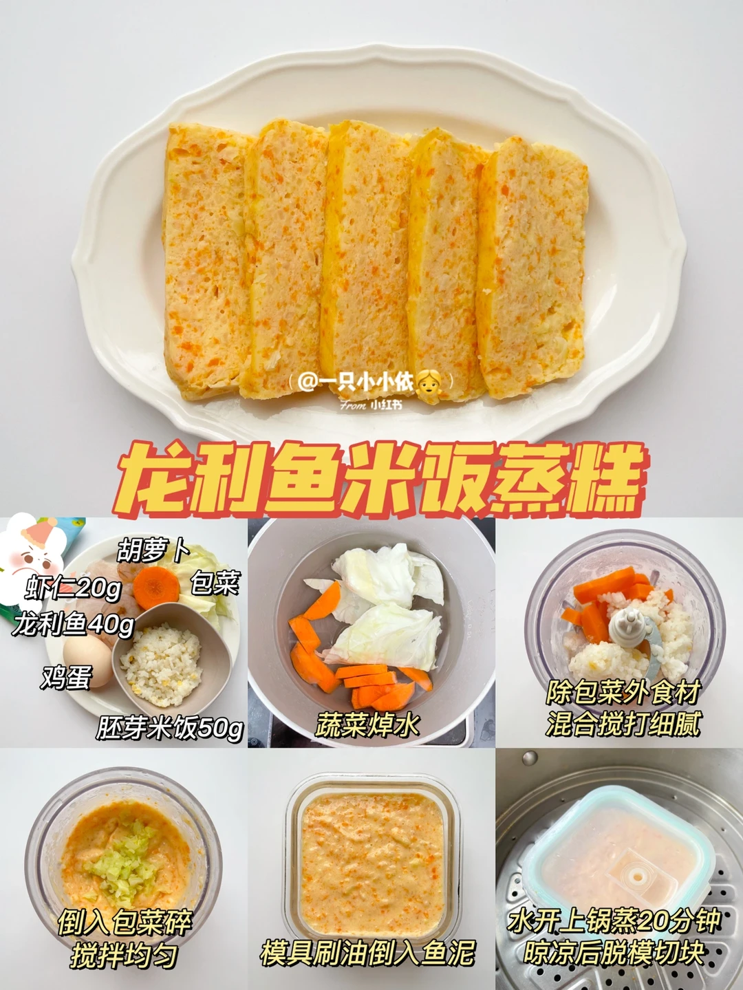 🔸食材:龙利鱼40g、虾仁20g、胡萝卜、包菜、鸡蛋、胚芽米饭50g