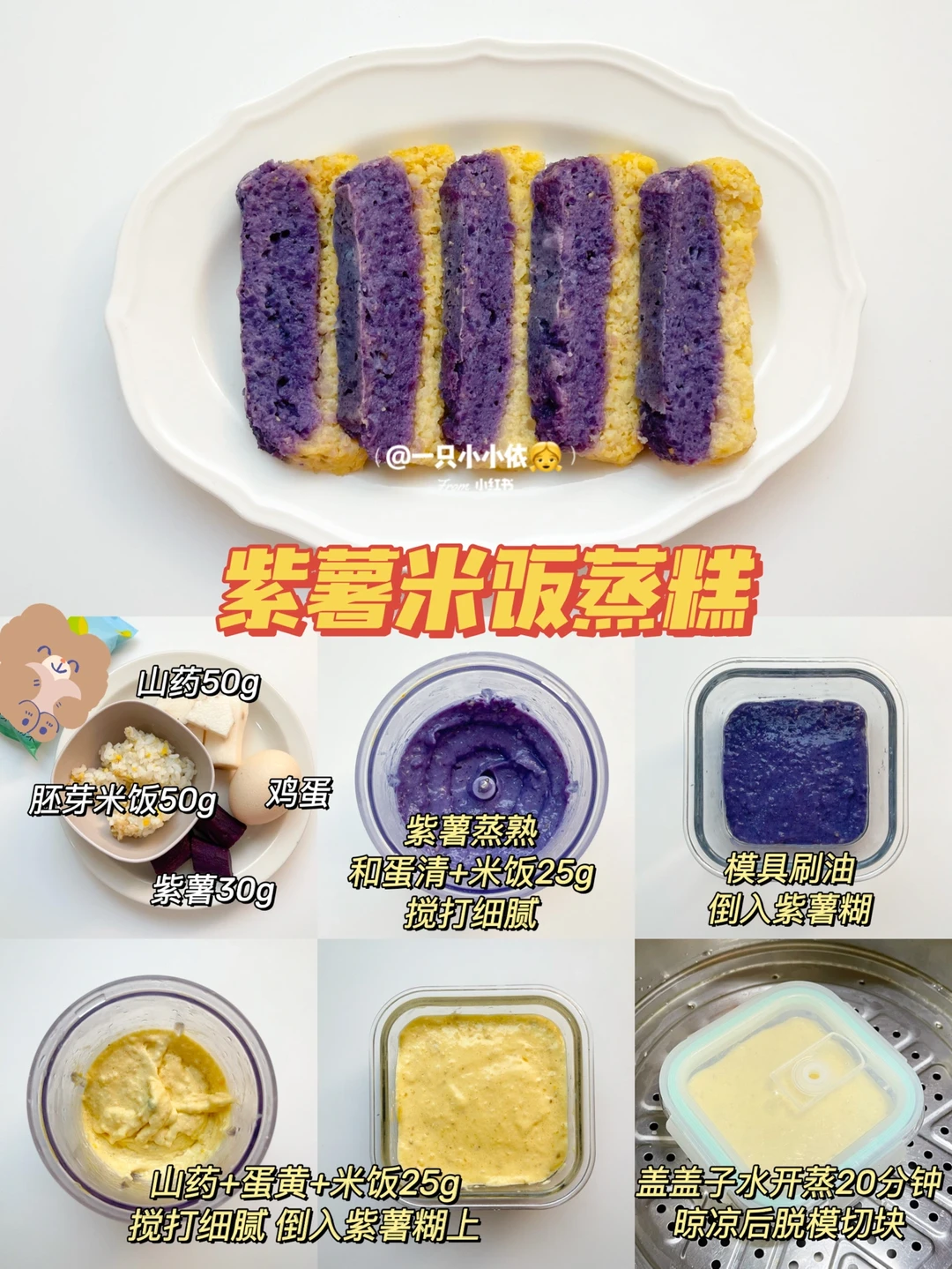 🔹步骤:①紫薯蒸熟,和蛋清+25g米饭搅打细腻;②模具刷油倒入紫薯糊;③山药+蛋黄+25g米饭搅打细腻,倒入紫薯糊上;④盖盖子水开蒸20分钟,晾凉后脱模切块