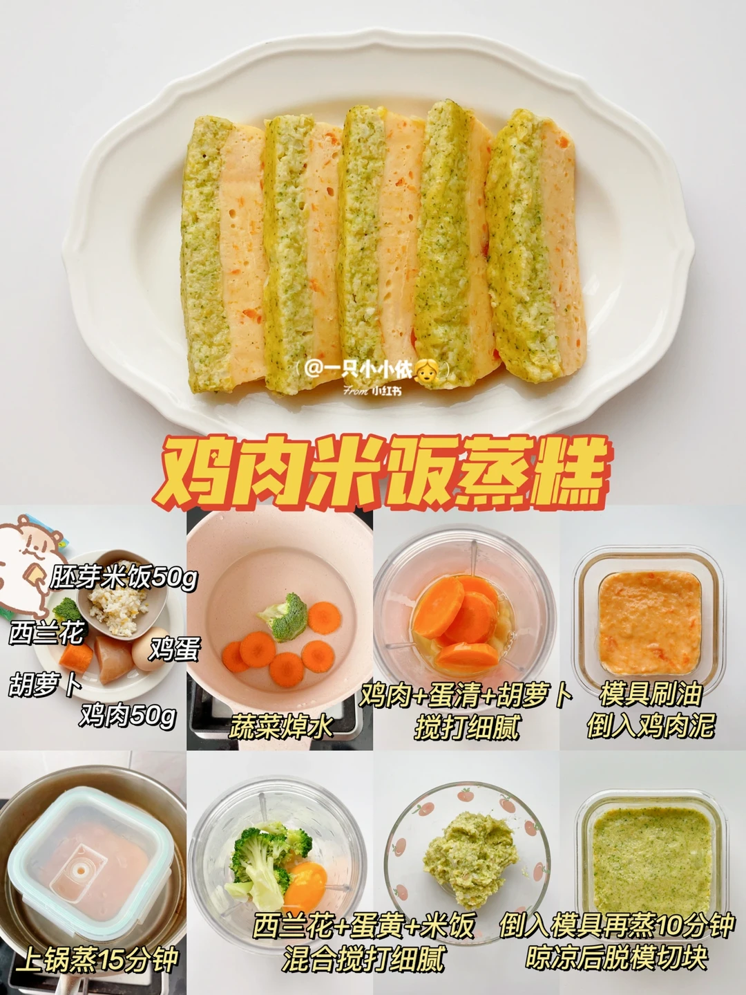 🔹步骤:①蔬菜焯水,鸡蛋+蛋清+胡萝卜搅打细腻;②模具刷油倒入鸡肉泥,上锅蒸15分钟;③西兰花+蛋黄+米饭,混合搅打细腻,倒入模具再蒸10分钟,晾凉后脱模切块