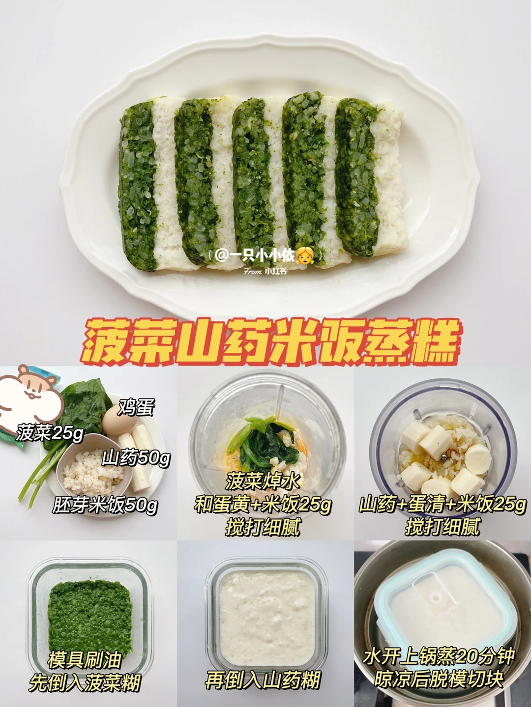 🔹步骤:①菠菜(焯水)+蛋黄+米饭25g搅打细腻;②山药+蛋清+米饭25g搅打细腻;③模具刷油,先倒入菠菜糊,再倒入山药糊;④盖盖子水开蒸20分钟,晾凉后脱模切块
