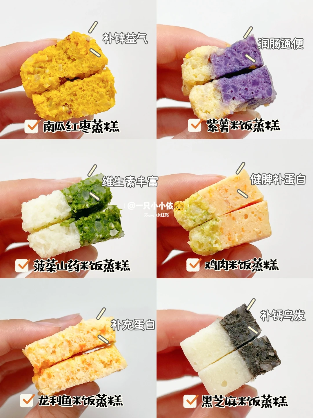 6⃣️种口味的米饭蒸糕,松软可口好消化,没牙宝宝也能吃😄谷物米搭配应季蔬菜和肉类,既有蛋白质,又有膳食纤维质的补充,营养密度很高,切成块状方便宝宝抓握,也可以放在辅食盒里带出去吃哦