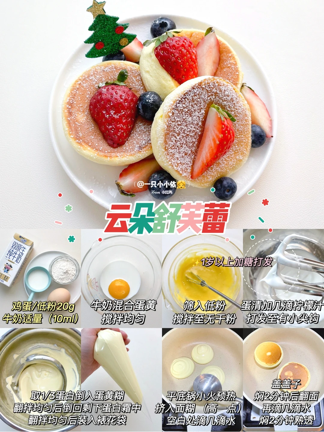 🔹做法:牛奶混合蛋黄搅拌均匀,筛入低粉搅拌至无干粉;蛋清加几滴柠檬汁打发至有小弯钩;取1/3蛋白霜倒入到蛋黄中翻拌均匀,再倒回剩下蛋白霜中翻拌均匀,装入裱花袋;平底锅小火预热挤入面糊,空白处滴几滴水,盖盖子焖2分钟后翻面,再滴几滴水焖2分钟熟透✅