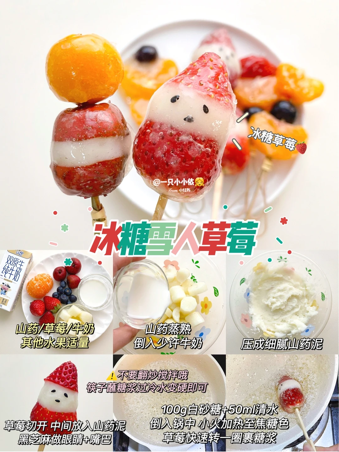 🔹做法:山药蒸熟,倒入少许牛奶压泥;草莓切开,中间放入山药泥,黑芝麻做眼睛和嘴巴;100g白砂糖+50ml清水倒入锅中,小火加热至焦糖色(不要翻炒搅拌),草莓快速转一圈裹糖浆✅