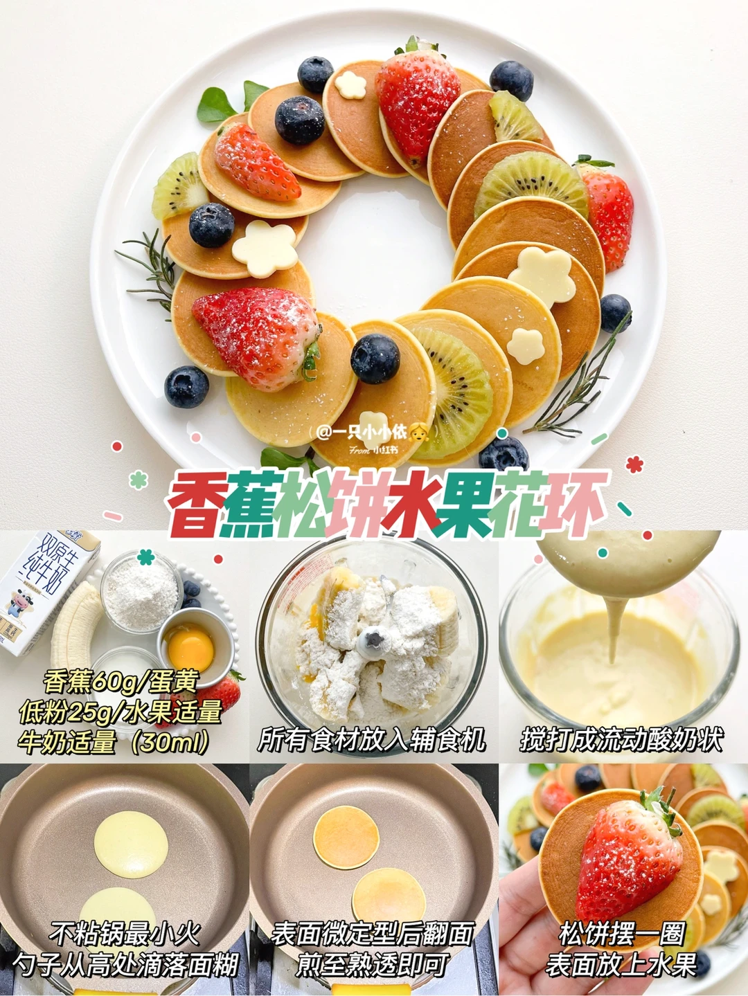 🔹做法:所有食材放入辅食机,搅打成流动酸奶状;不粘锅最小火,勺子从高处低落面糊;表面微定型后翻面,煎至熟透即可;松饼摆一圈,表面放上水果✅