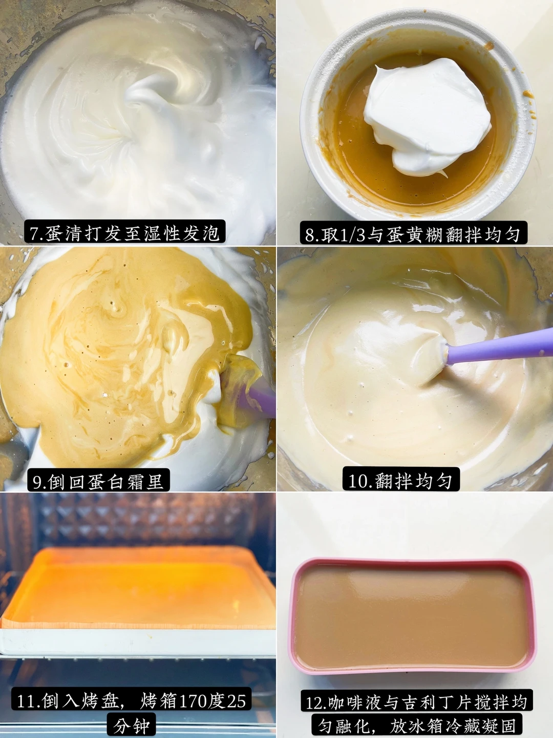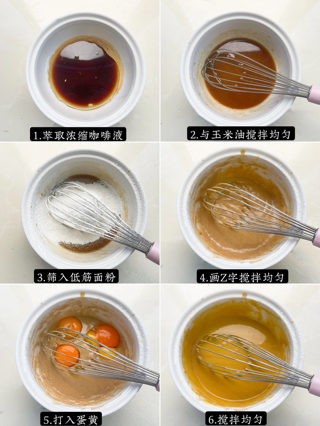 蛋糕胚:浓缩咖啡液70g 玉米油60g 细砂糖60g 低筋面粉90g 蛋黄80g 蛋清160g