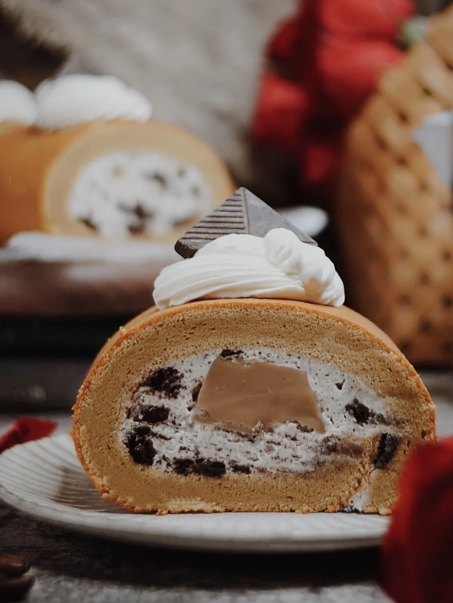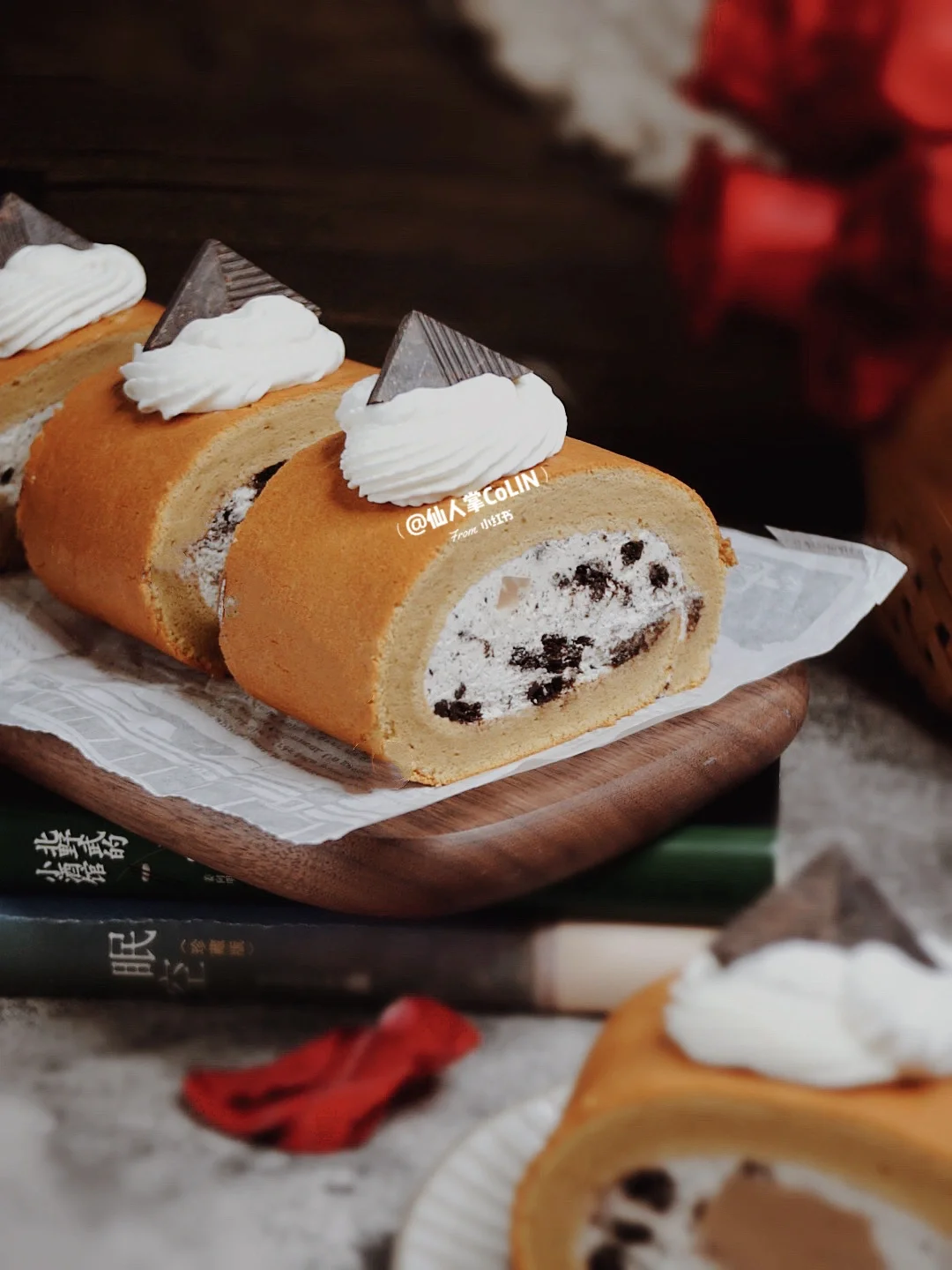 6️⃣利用擀面杖,一手提起油纸,一手整理蛋糕胚。一气呵成。放冰箱冷藏2个小时以上。就可以切块吃了