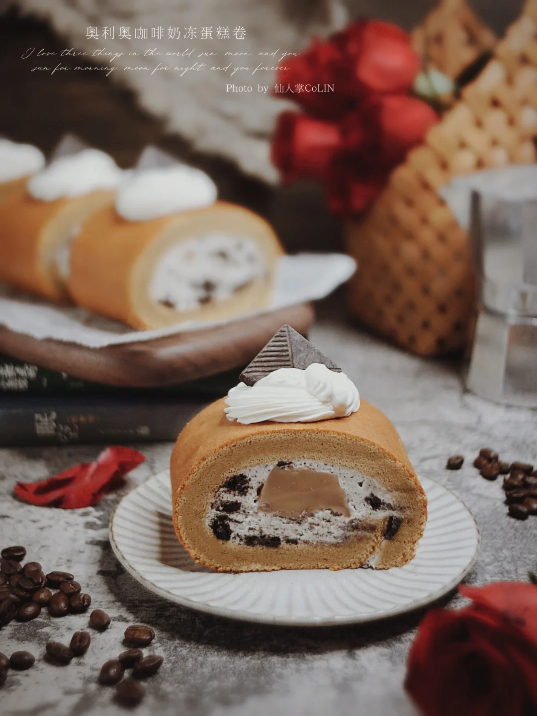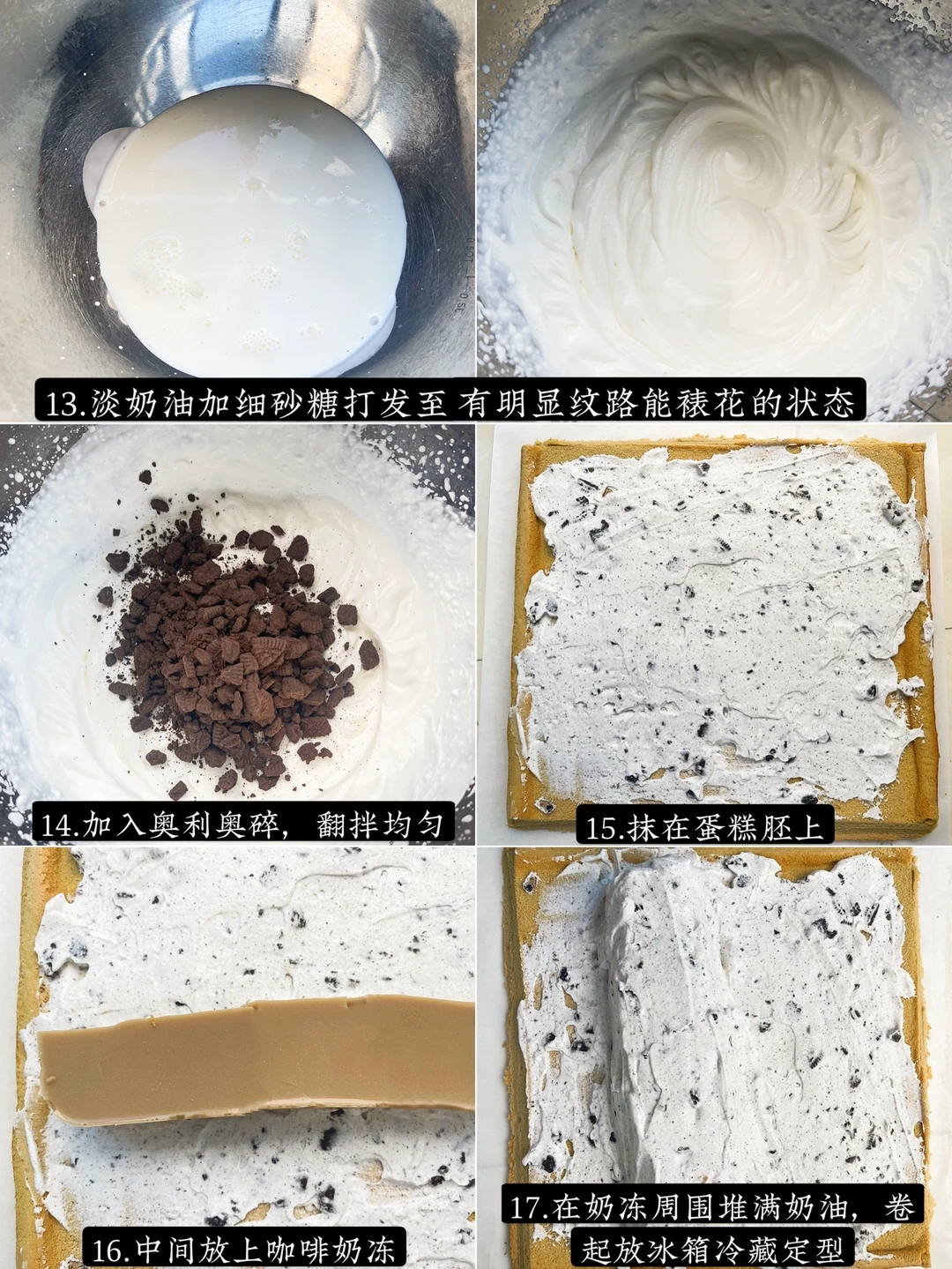 5️⃣蛋糕胚的上下两边切一个小斜坡,抹上一层打发好的奥利奥奶油,中间放上咖啡奶冻,把剩余的淡奶油均匀的抹在四周