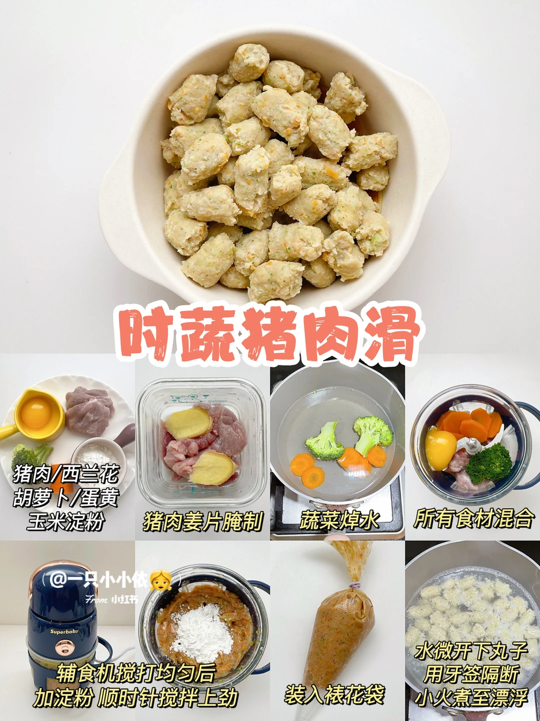 🔸食材:猪肉/西兰花/胡萝卜/蛋黄/玉米淀粉