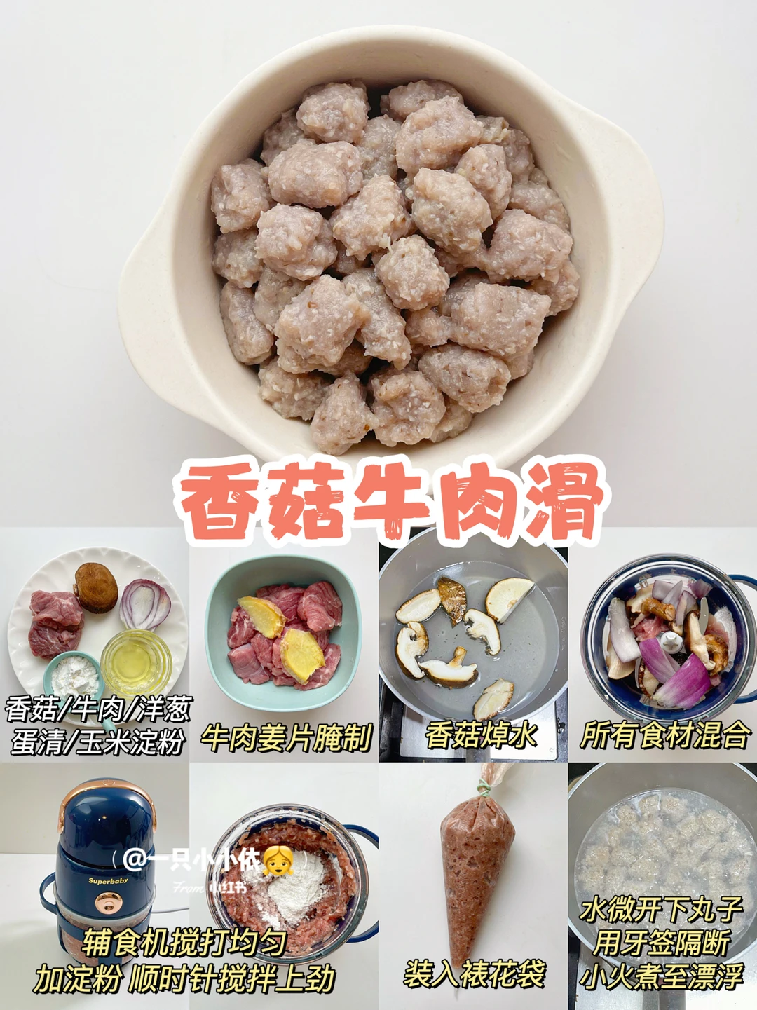 🔹做法:牛肉姜片腌制,香菇焯水,所有食材混合搅打均匀,加淀粉顺时针搅拌上劲,装入裱花袋;水微开下丸子,用牙签隔断,小火煮至漂浮