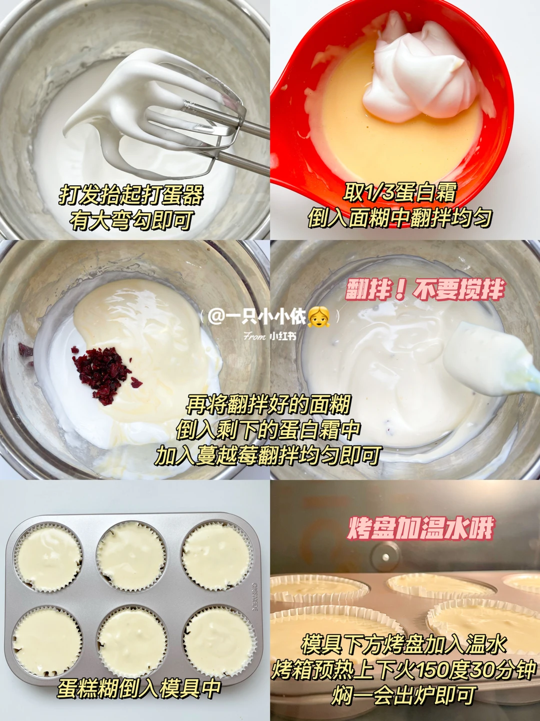3️⃣取1/3蛋白霜倒入面糊中翻拌均匀,再将翻拌好的面糊倒入剩下的蛋白霜中,加入蔓越莓翻拌均匀,倒入模具中;