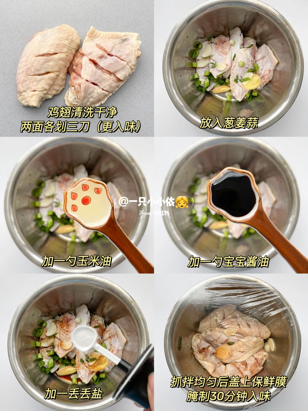 1⃣️鸡翅清洗干净,两面各划三刀,放入葱姜蒜、1勺玉米油、1勺宝宝酱油、少量盐,抓拌均匀后盖上保鲜膜,腌制30分钟入味;