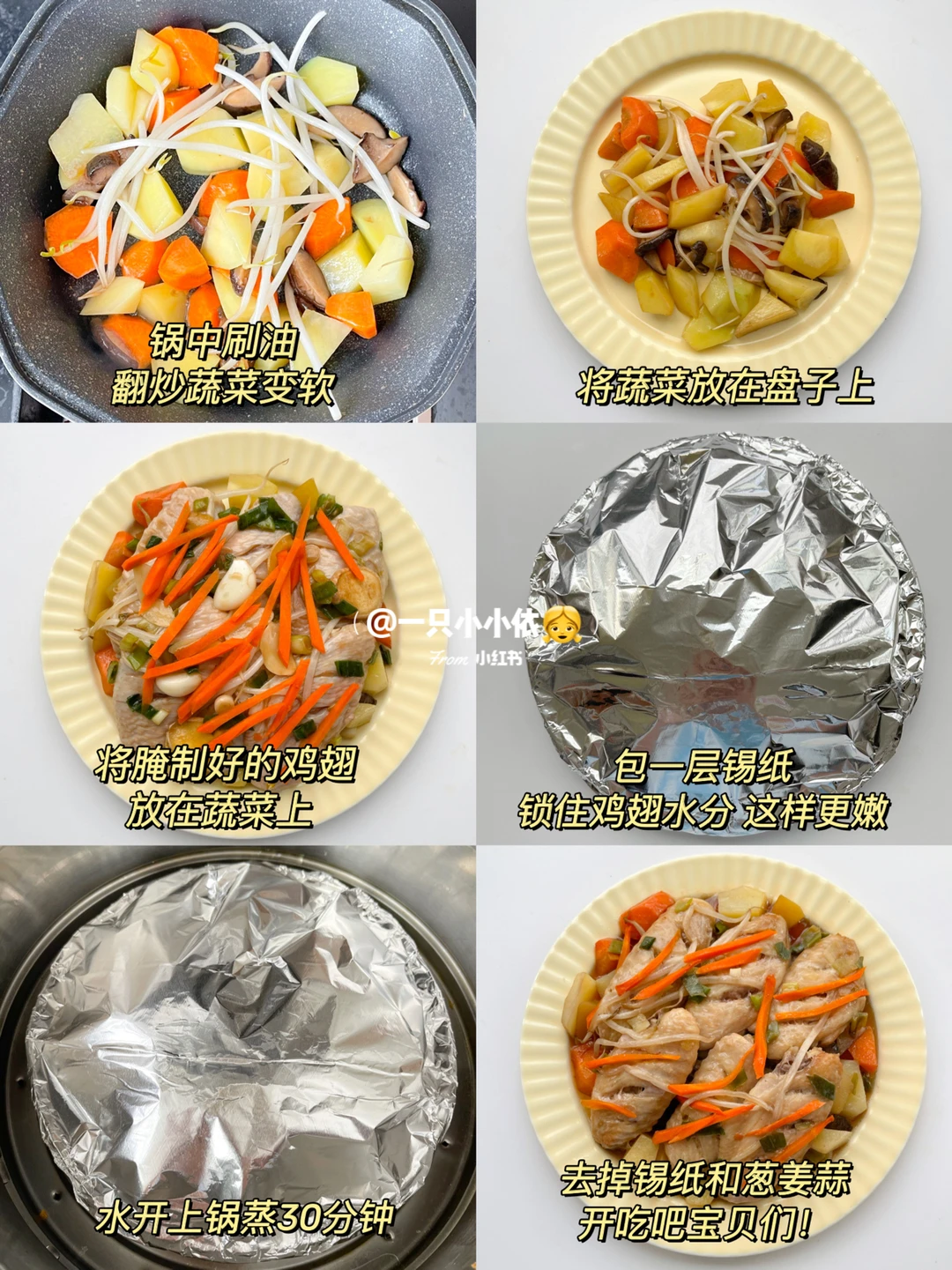 3⃣️将腌好的鸡翅铺在蔬菜上,包一层锡纸,水开上锅蒸30分钟即可
