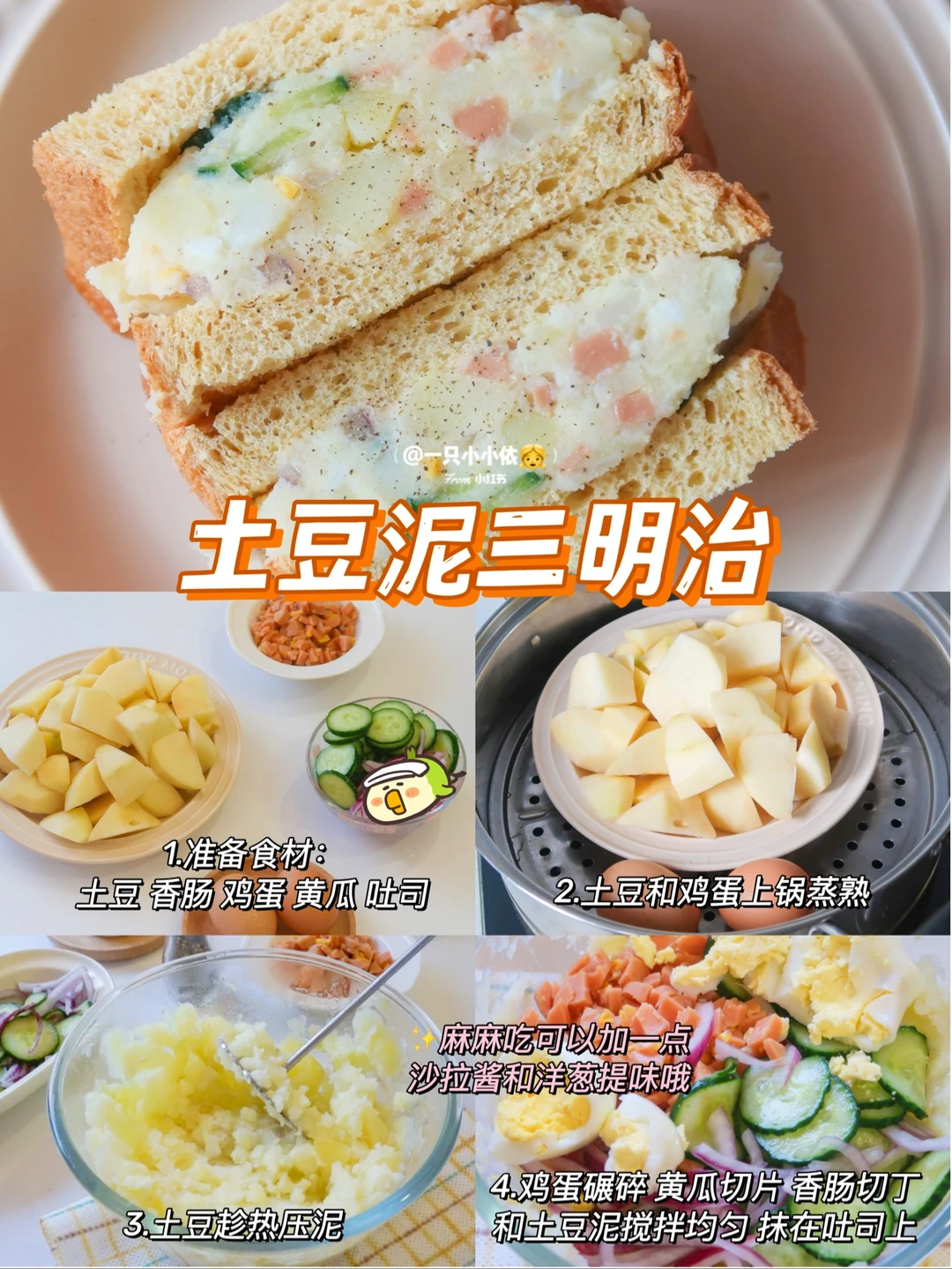🔹做法:土豆和鸡蛋上锅蒸熟,土豆趁热压泥,鸡蛋碾碎,黄瓜切片,香肠切丁,所有食材混合搅拌均匀,抹在吐司上;