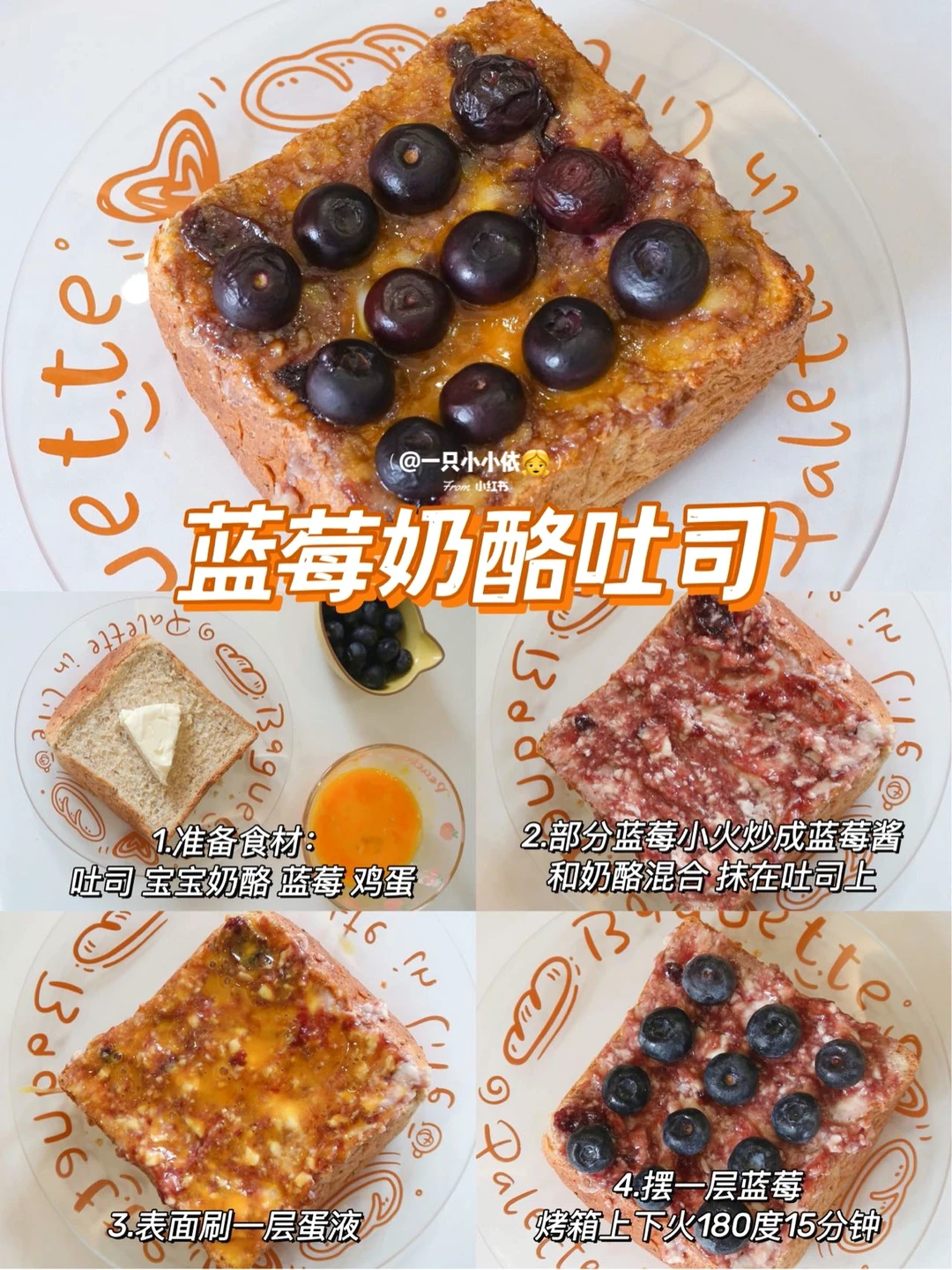 🔹做法:部分蓝莓小火炒成蓝莓酱,和奶酪混合,抹在吐司上,表面刷一层蛋液,再摆一层蓝莓;烤箱上下火180度15分钟