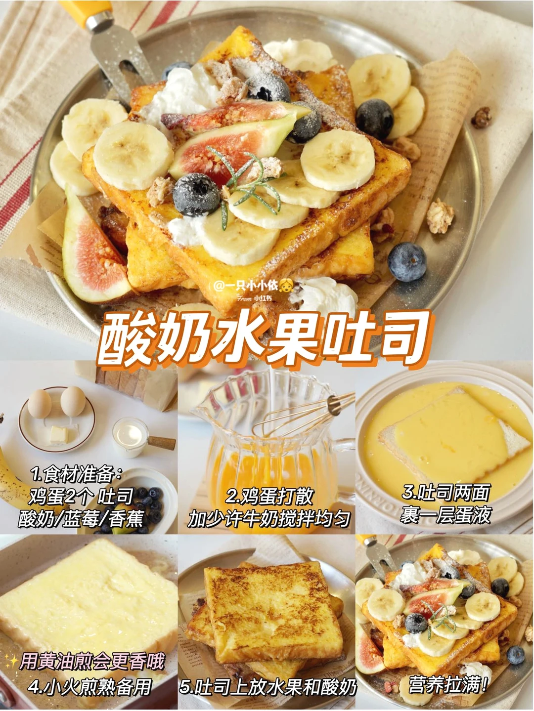 🔹做法:鸡蛋打散,加少许牛奶搅拌均匀;吐司两面裹一层蛋液,小火煎熟备用;吐司上放水果和酸奶后开吃;