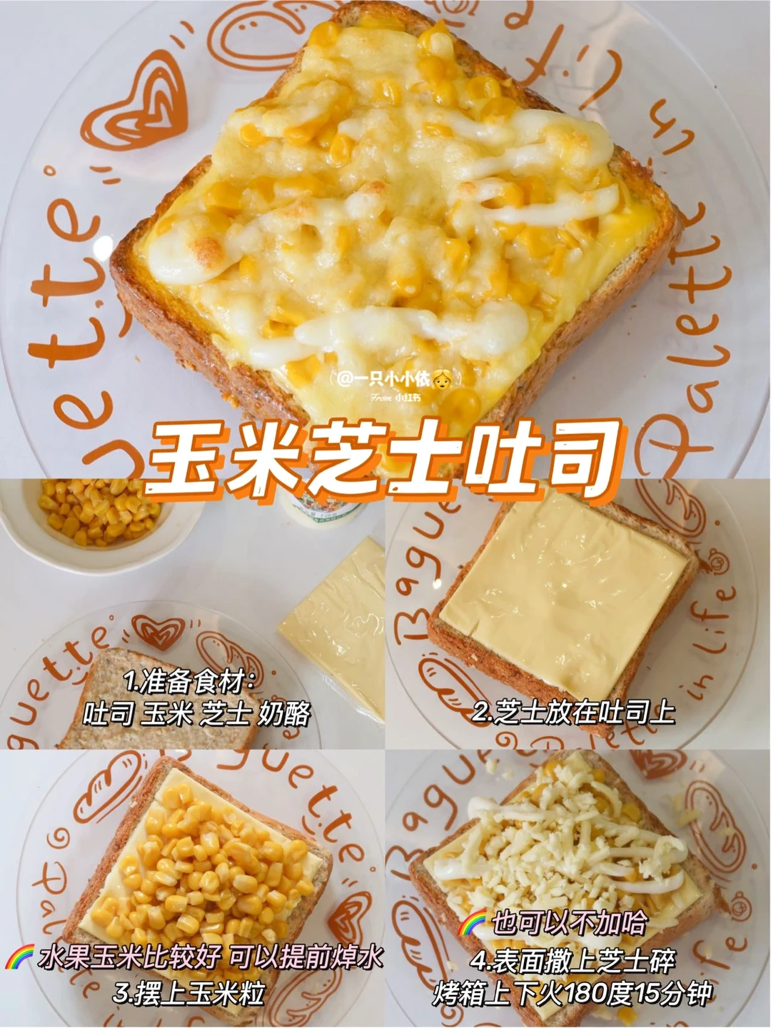🔹做法:芝士放在吐司上,摆上玉米粒,表面再撒一层芝士碎,烤箱上下火180度15分钟
