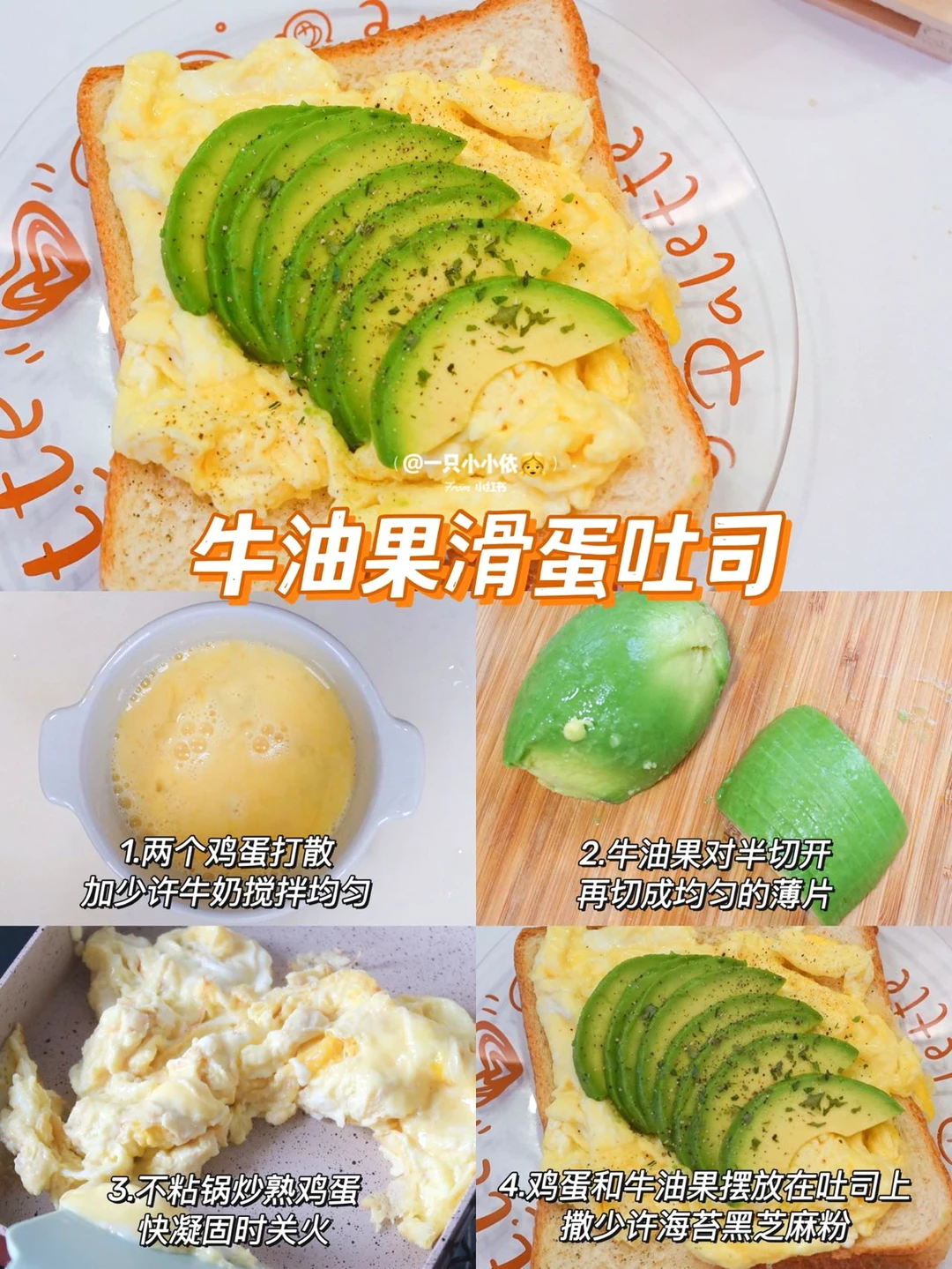 🔹做法:两个鸡蛋打散,加少许牛奶搅拌均匀;牛油果对半切开,再切成均匀的薄片;不粘锅炒熟鸡蛋,快凝固时关火;将鸡蛋和牛油果放在吐司上,撒少许海苔黑芝麻粉;
